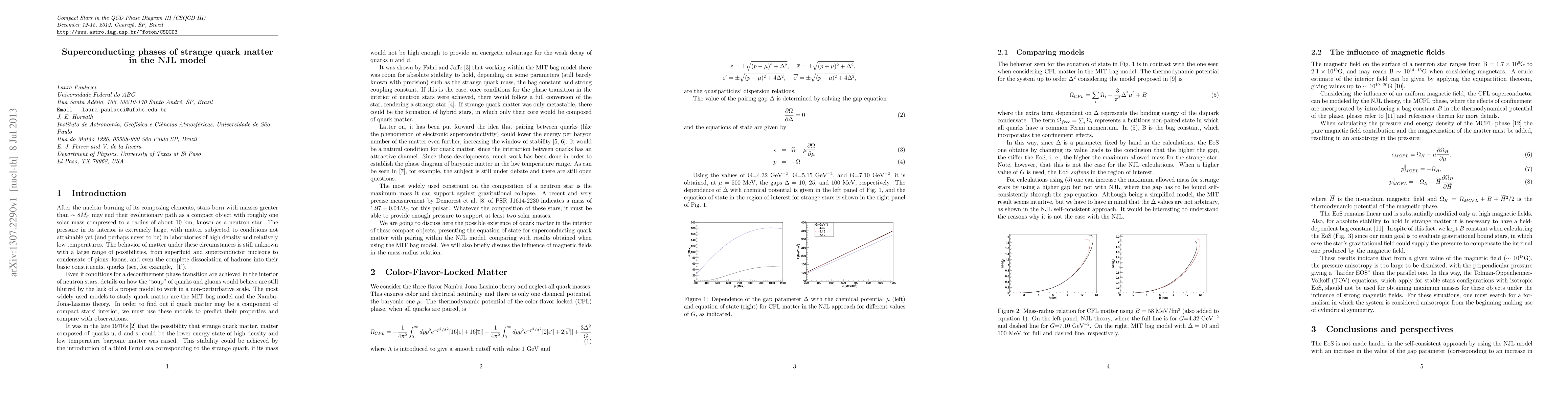 This paper investigates the superconducting phases of strange quark matter using the NJL model, focusing on the color-flavor-locked phase under magnetic fields and comparing results with the MIT Bag Model to analyze the pairing gap and its impact on the equation of state.