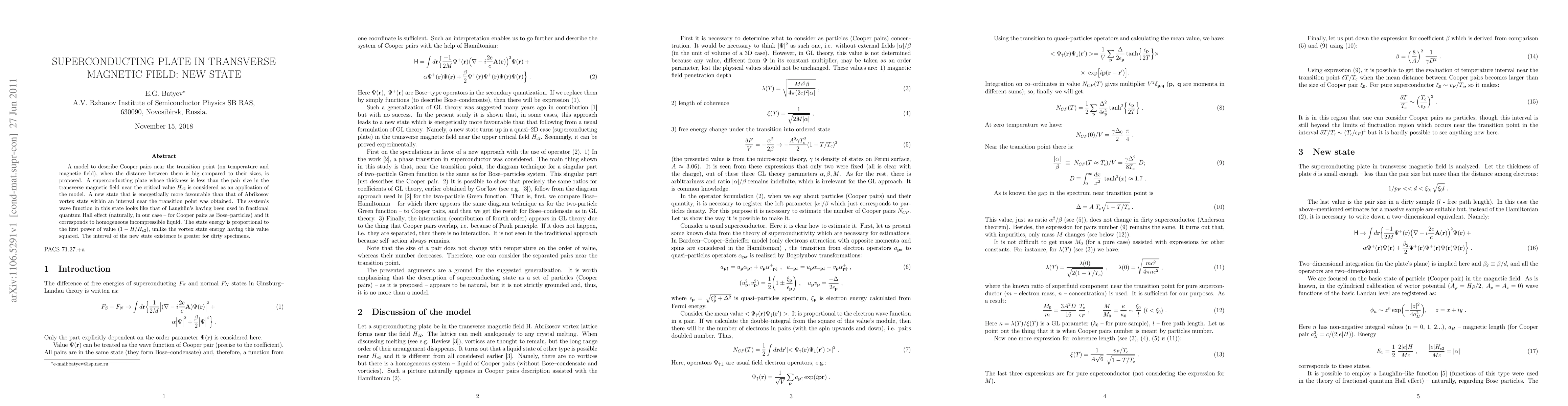 A model to describe Cooper pairs near the transition point (on temperature and magnetic field), when the distance between them is big compared to their sizes, is proposed. A superconducting plate whose thickness is less than the pair size in the transverse magnetic field near the critical value $H_{c2}$ is considered as an application of the model. A new state that is energetically more favourable than that of Abrikosov vortex state within an interval near the transition point was obtained. The system's wave function in this state looks like that of Laughlin's having been used in fractional quantum Hall effect (naturally, in our case - for Cooper pairs as Bose-particles) and it corresponds to homogeneous incompressible liquid. The state energy is proportional to the first power of value $(1 - H/H_{c2})$, unlike the vortex state energy having this value squared. The interval of the new state existence is greater for dirty specimens.