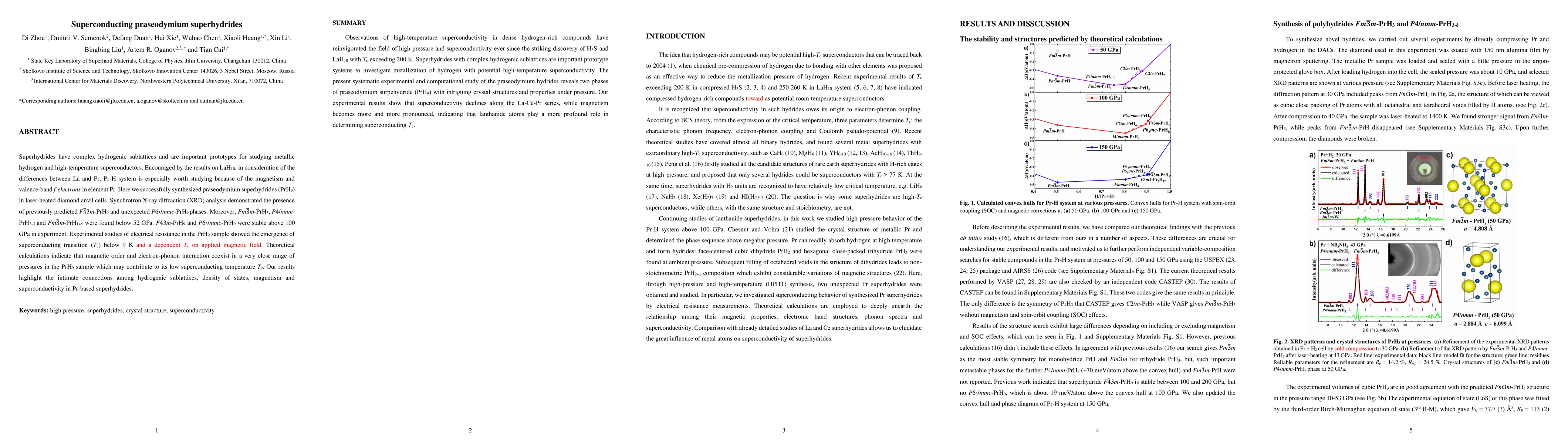 Superhydrides have complex hydrogenic sublattices and are important prototypes for studying metallic hydrogen and high-temperature superconductors. Encouraged by the results on LaH10, in consideration of the differences between La and Pr, Pr-H system is especially worth studying because of the magnetism and valence-band f-electrons in element Pr. Here we successfully synthesized praseodymium superhydrides (PrH9) in laser-heated diamond anvil cells. Synchrotron X-ray diffraction (XRD) analysis demonstrated the presence of previously predicted F43m-PrH9 and unexpected P63/mmc-PrH9 phases. Moreover, Fm3m-PrH3, P4/nmm-PrH(3-{\delta}) and Fm3m-PrH(1+x) were found below 52 GPa. F43m-PrH9 and P63/mmc-PrH9 were stable above 100 GPa in experiment. Experimental studies of electrical resistance in the PrH9 sample showed the emergence of superconducting transition (Tc) below 9K and a dependent Tc on applied magnetic field. Theoretical calculations indicate that magnetic order and electron-phonon interaction coexist in a very close range of pressures in the PrH9 sample which may contribute to its low superconducting temperature Tc. Our results highlight the intimate connections among hydrogenic sublattices, density of states, magnetism and superconductivity in Pr-based superhydrides.