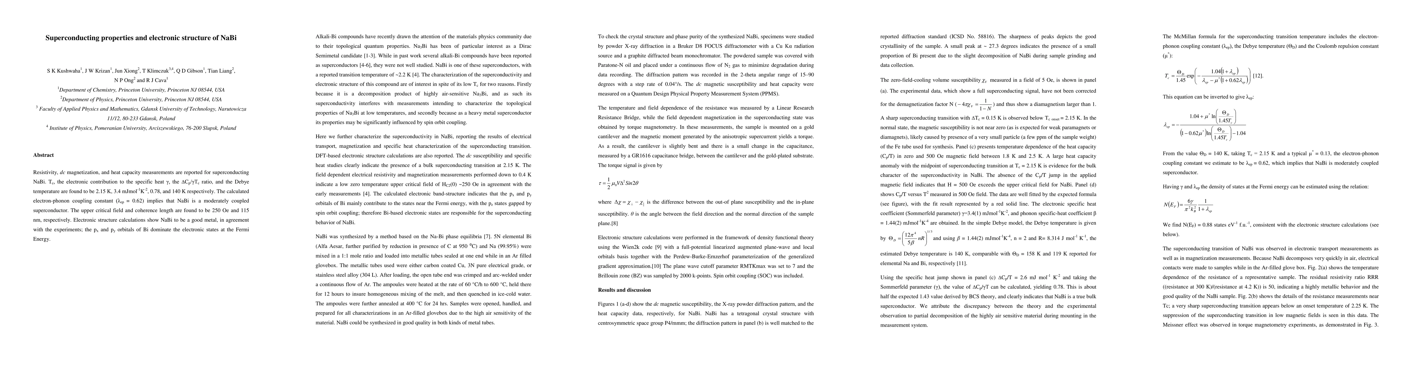 NaBi exhibits superconductivity with a transition temperature of 2.15 K, characterized by moderately strong electron-phonon coupling. Electronic structure analysis reveals that the px and py orbitals of Bi primarily contribute to the Fermi surface, confirming NaBi as a good metal.