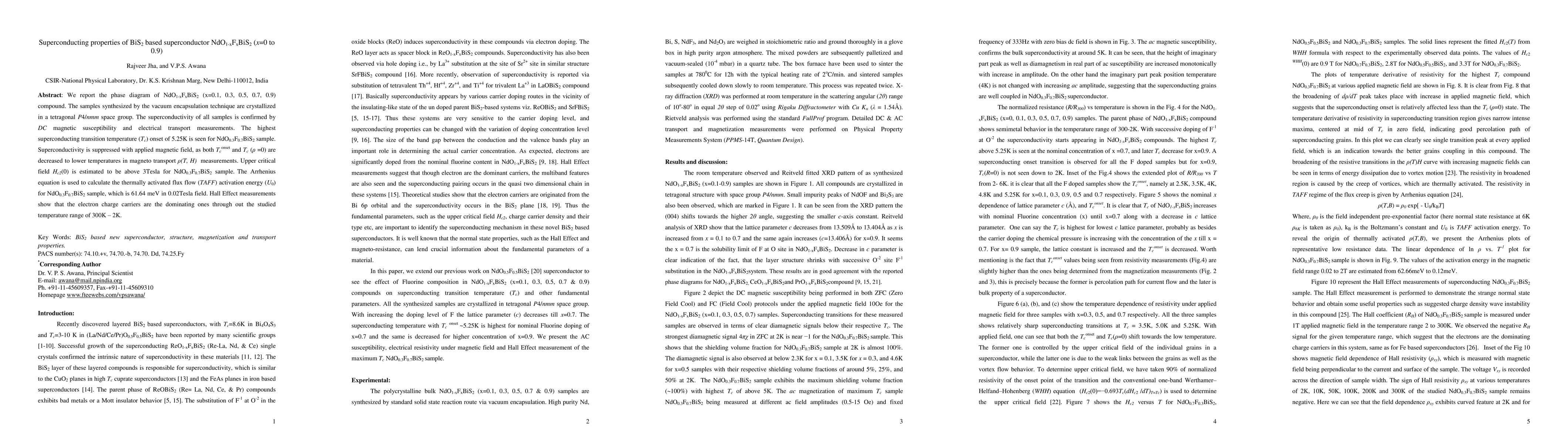 Researchers discovered a new superconductor NdO1-xFxBiS2 with a maximum Tc of 5.25K and found that electrons are the dominant charge carriers in these systems.