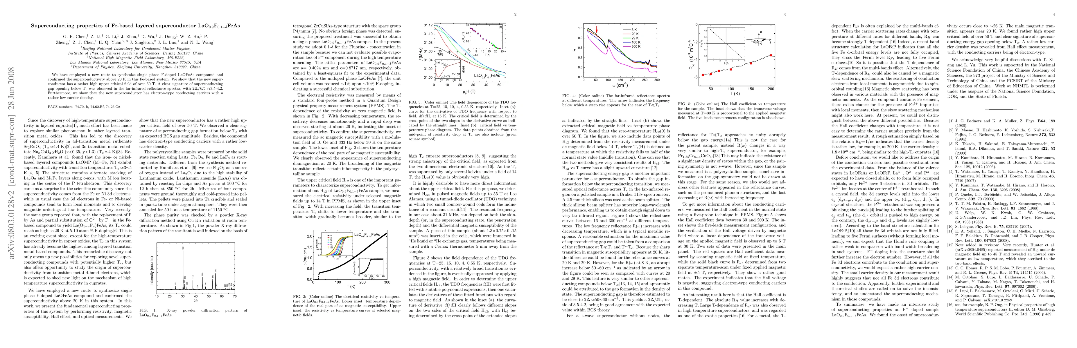 We have employed a new route to synthesize single phase F-doped LaOFeAs compound and confirmed the superconductivity above 20 K in this Fe-based system. We show that the new superconductor has a rather high upper critical field of about 54 T. A clear signature of superconducting gap opening below T$_c$ was observed in the far-infrared reflectance spectra, with 2$\Delta/\textit{k}T_c\approx$3.5-4.2. Furthermore, we show that the new superconductor has electron-type conducting carrier with a rather low carrier density.
