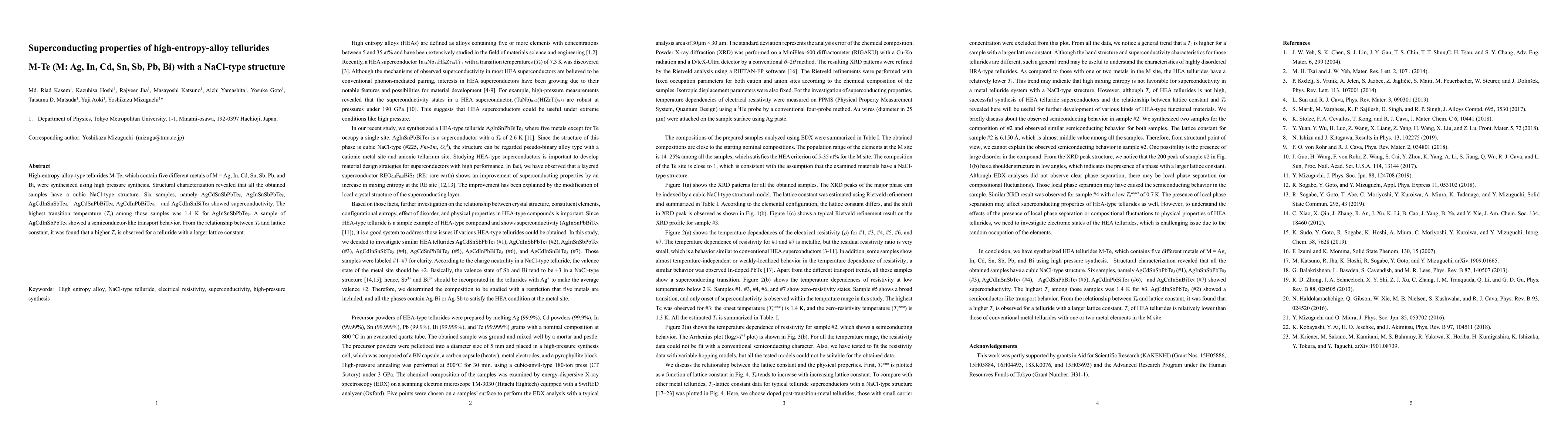 High-entropy-alloy-type tellurides M-Te, which contain five different metals of M = Ag, In, Cd, Sn, Sb, Pb, and Bi, were synthesized using high pressure synthesis. Structural characterization revealed that all the obtained samples have a cubic NaCl-type structure. Six samples, namely AgCdSnSbPbTe5, AgInSnSbPbTe5, AgCdInSnSbTe5, AgCdSnPbBiTe5, AgCdInPbBiTe5, and AgCdInSnBiTe5 showed superconductivity. The highest transition temperature (Tc) among those samples was 1.4 K for AgInSnSbPbTe5. A sample of AgCdInSbPbTe5 showed a semiconductor-like transport behavior. From the relationship between Tc and lattice constant, it was found that a higher Tc is observed for a telluride with a larger lattice constant.