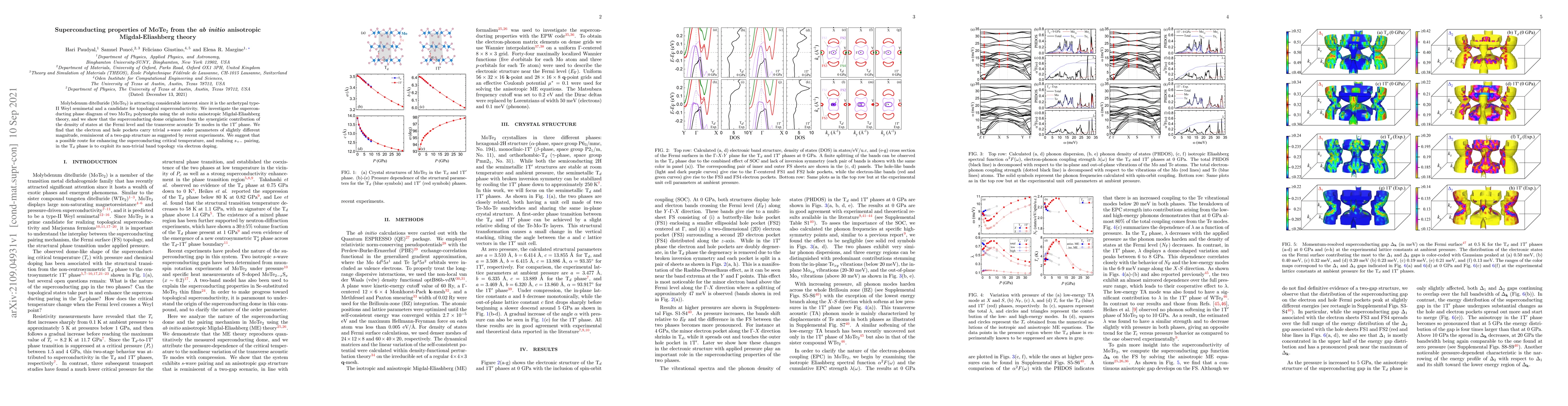 Molybdenum ditelluride (MoTe$_2$) is attracting considerable interest since it is the archetypal type-II Weyl semimetal and a candidate for topological superconductivity. We investigate the superconducting phase diagram of two MoTe$_2$ polymorphs using the $ab~initio$ anisotropic Migdal-Eliashberg theory, and we show that the superconducting dome originates from the synergistic contribution of the density of states at the Fermi level and the transverse acoustic Te modes in the 1T$^\prime$ phase. We find that the electron and hole pockets carry trivial $s$-wave order parameters of slightly different magnitude, reminiscent of a two-gap structure as suggested by recent experiments. We suggest that a possible route for enhancing the superconducting critical temperature, and realizing $s_{+-}$ pairing, in the T$_d$ phase is to exploit its non-trivial band topology via electron doping.