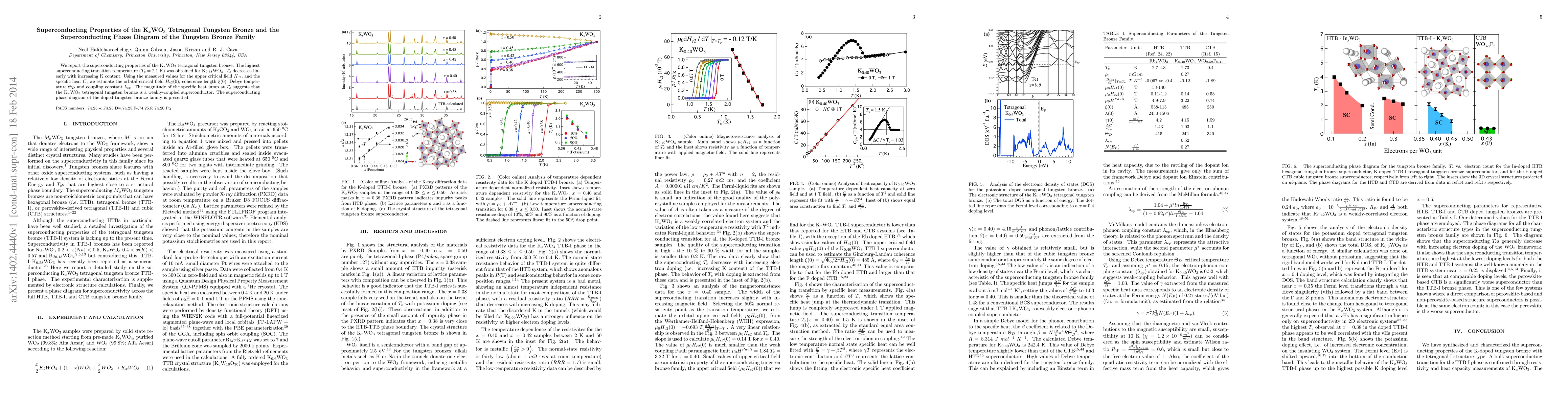 We report the superconducting properties of the K$_{x}$WO$_{3}$ tetragonal tungsten bronze. The highest superconducting transition temperature ($T_{c}=2.1$K) was obtained for K$_{0.38}$WO$_{3}$. $T_{c}$ decreases linearly with increasing K content. Using the measured values for the upper critical field $H_{c2}$, and the specific heat $C$, we estimate the orbital critical field $H_{c2}$(0), coherence length $\xi$(0), Debye temperature $\Theta _{D}$ and coupling constant $\lambda _{ep}$. The magnitude of the specific heat jump at $T_{c}$ suggests that the K$_{x}$WO$_{3}$ tetragonal tungsten bronze is a weakly-coupled superconductor. The superconducting phase diagram of the doped tungsten bronze family is presented.