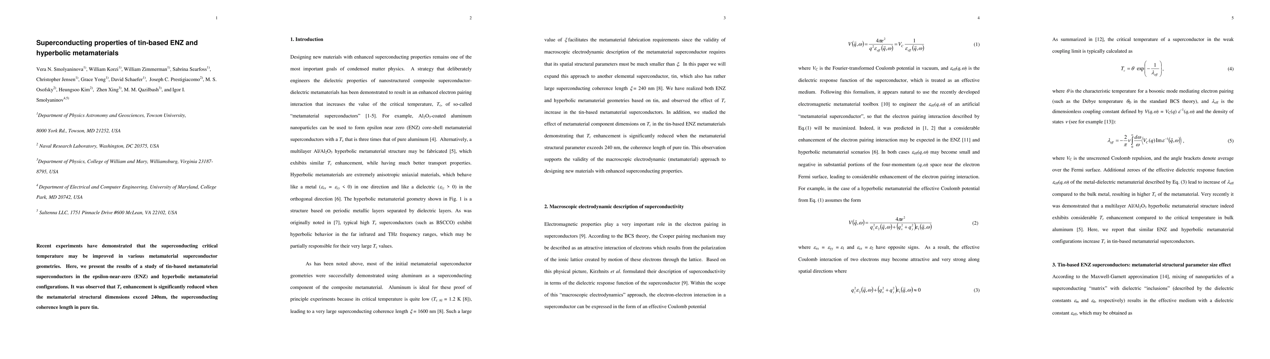 This study investigates tin-based superconductors in epsilon-near-zero (ENZ) and hyperbolic metamaterial configurations, finding that Tc enhancement diminishes when structural dimensions surpass 240nm, the coherence length of pure tin.