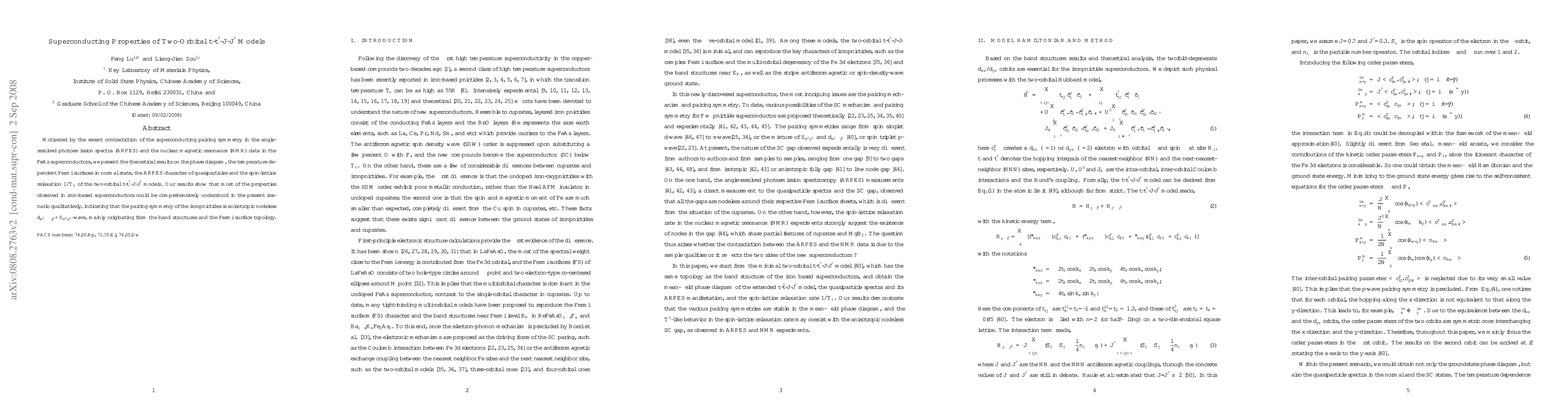 This paper investigates the superconducting properties of two-orbital t-t'-J-J' models, finding that the observed properties in FeAs superconductors align with an anisotropic nodeless s-wave pairing symmetry, primarily influenced by the band structures and Fermi surface topology. The theoretical results cover phase diagrams, temperature-dependent Fermi surfaces, ARPES quasiparticle characteristics, and spin-lattice relaxation.