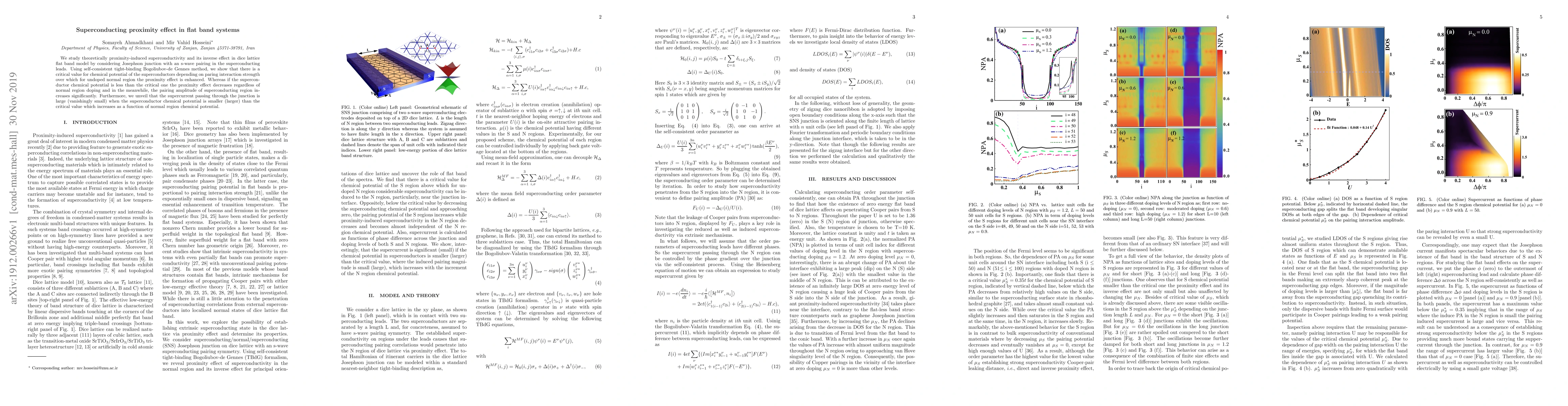 This paper investigates the superconducting proximity effect in flat band systems using a dice lattice model, revealing that the effect is enhanced when the superconductor's chemical potential exceeds a critical value determined by pairing strength, while supercurrent is maximized when the chemical potential is below this critical threshold.