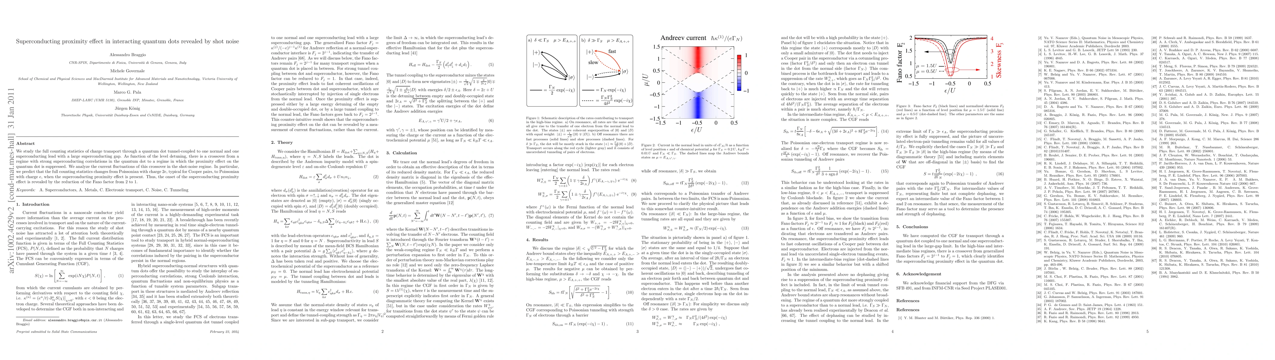 This paper investigates the superconducting proximity effect in quantum dots via shot noise, revealing a transition from Cooper pair to single electron transport as the proximity effect becomes dominant. The Fano factor decreases from 2 to 1, indicating a shift from superconducting correlations to normal conductance.