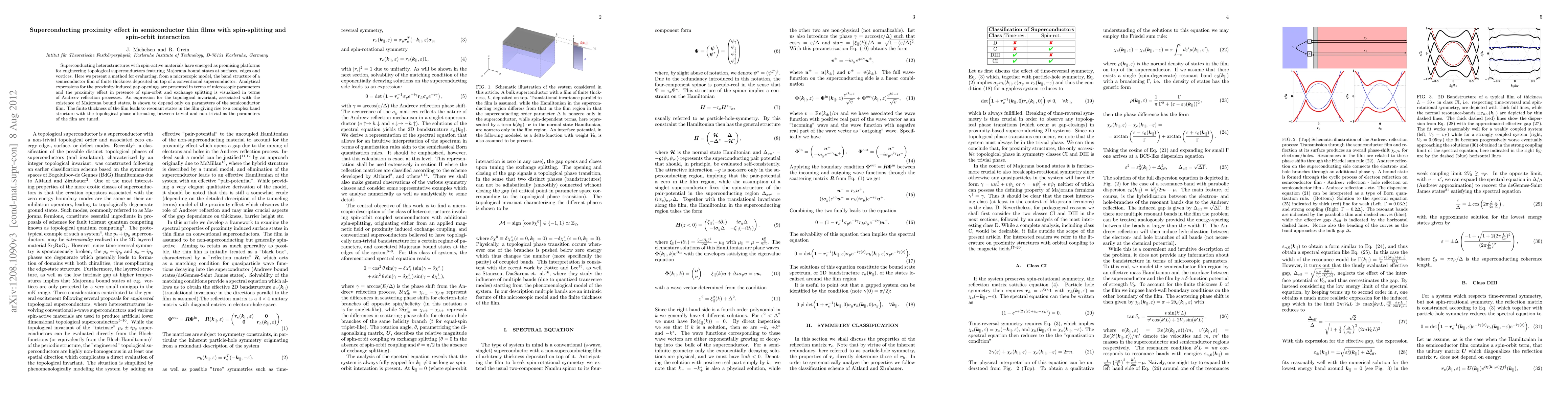 This paper investigates superconducting proximity effects in semiconductor thin films with spin-splitting and spin-orbit interaction, revealing how these factors influence the band structure and induce topological phases. It demonstrates that the topological invariant depends solely on semiconductor parameters, leading to a complex band structure with alternating topological phases.