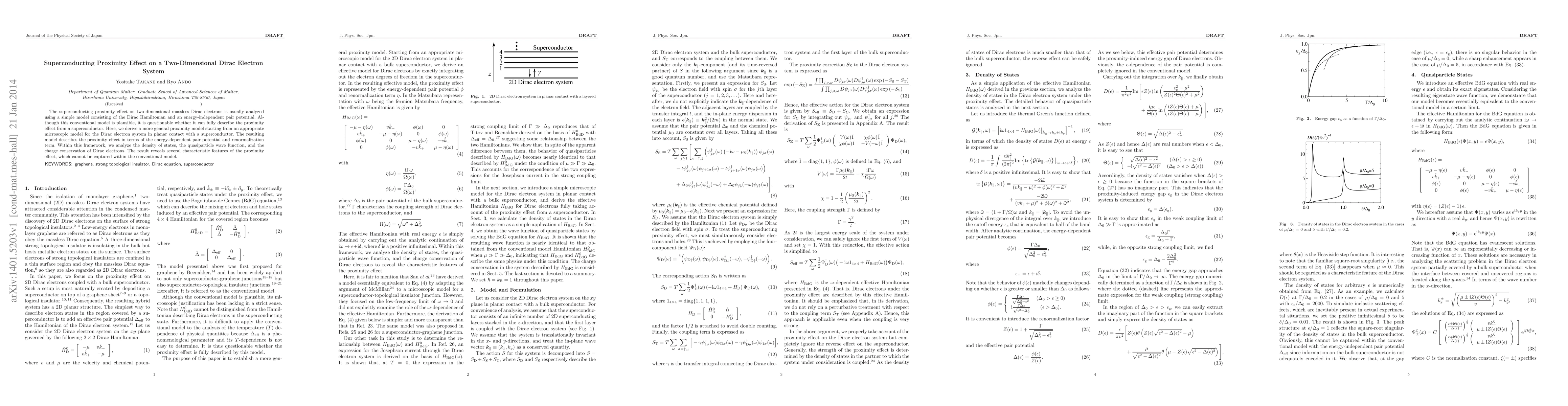 This paper develops a more comprehensive model for the superconducting proximity effect on two-dimensional Dirac electron systems, moving beyond the conventional energy-independent pair potential. The new model incorporates an energy-dependent pair potential and renormalization, revealing unique features of the proximity effect not captured by the traditional approach.