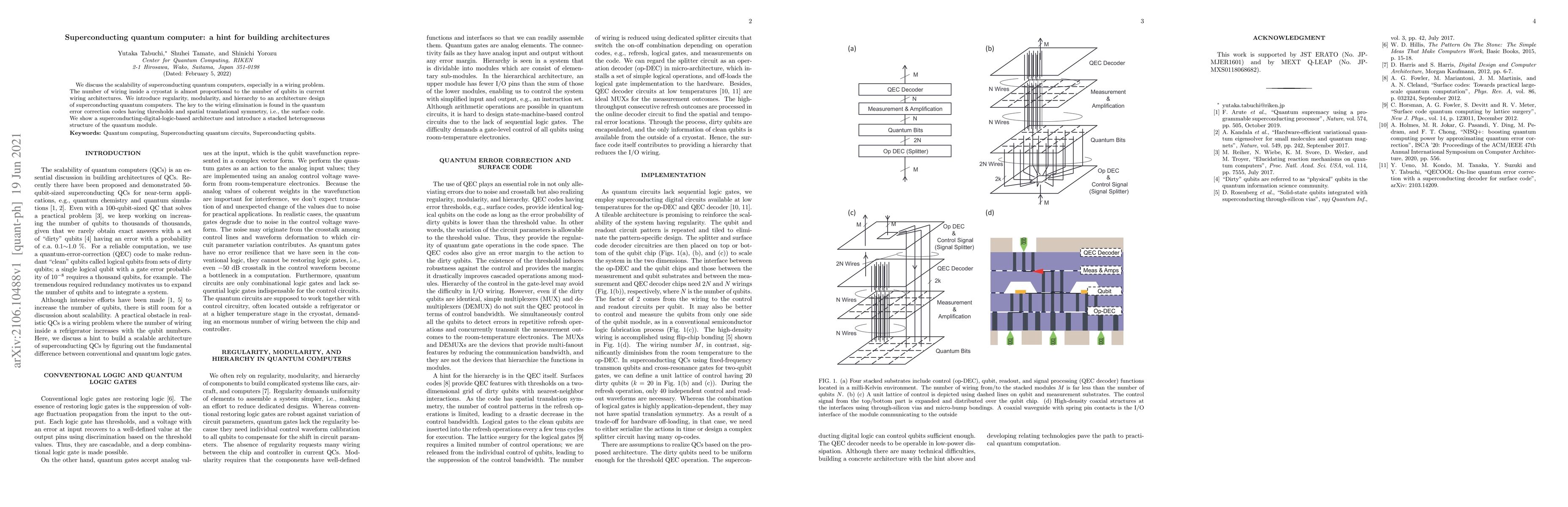 This paper explores the scalability of superconducting quantum computers, focusing on reducing wiring complexity by introducing regularity, modularity, and hierarchy in architecture design. The proposed solution leverages quantum error correction codes, particularly the surface code, to eliminate excessive wiring, and presents a superconducting-digital-logic-based architecture with a stacked quantum module structure.