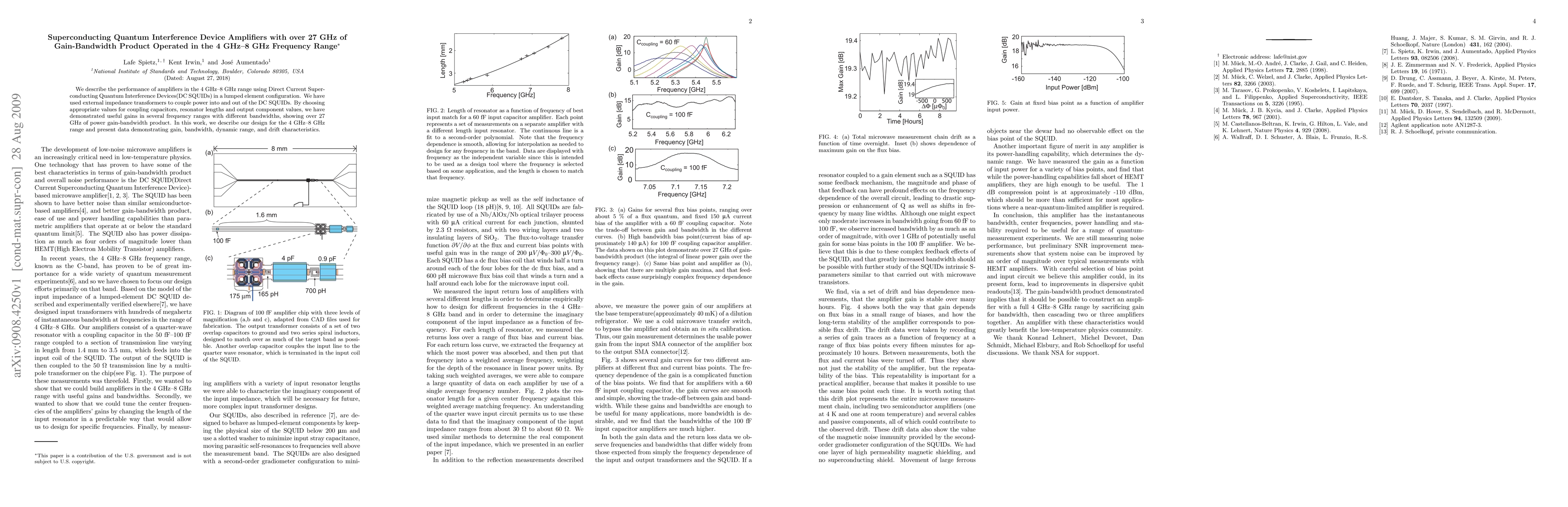 This paper details the design and performance of amplifiers using DC SQUIDs in the 4 GHz-8 GHz range, achieving over 27 GHz of gain-bandwidth product. The study employs lumped element configurations and external impedance transformers, optimizing component values to demonstrate effective gain and bandwidth.