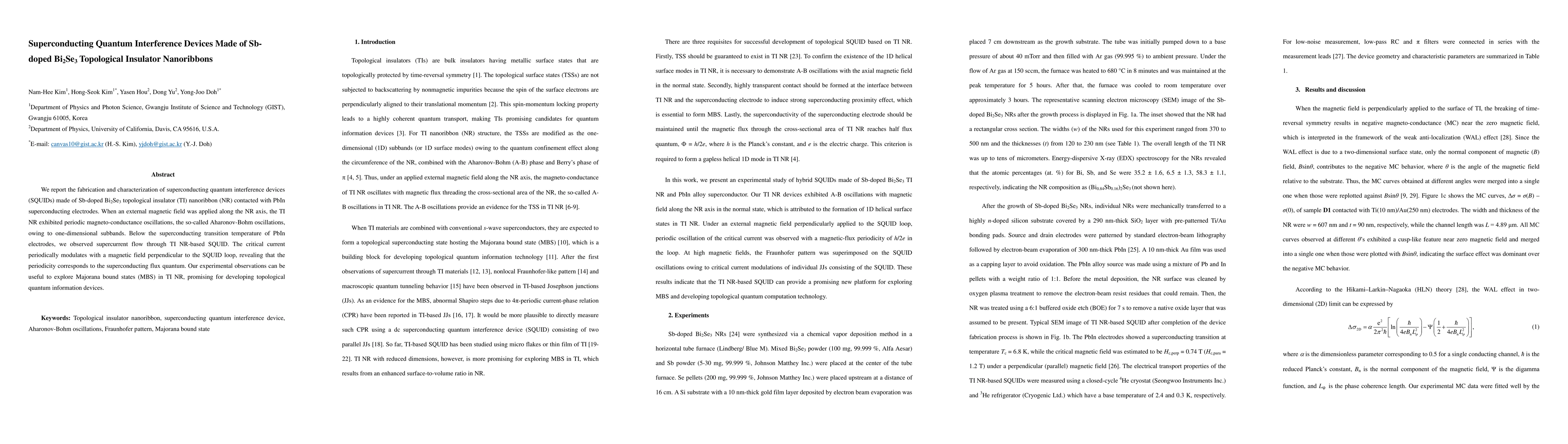 This paper reports the fabrication of SQUIDs using Sb-doped Bi2Se3 topological insulator nanoribbons contacted with PbIn superconducting electrodes, showing Aharonov-Bohm oscillations and supercurrent flow, which may facilitate the study of Majorana bound states for future quantum information devices.