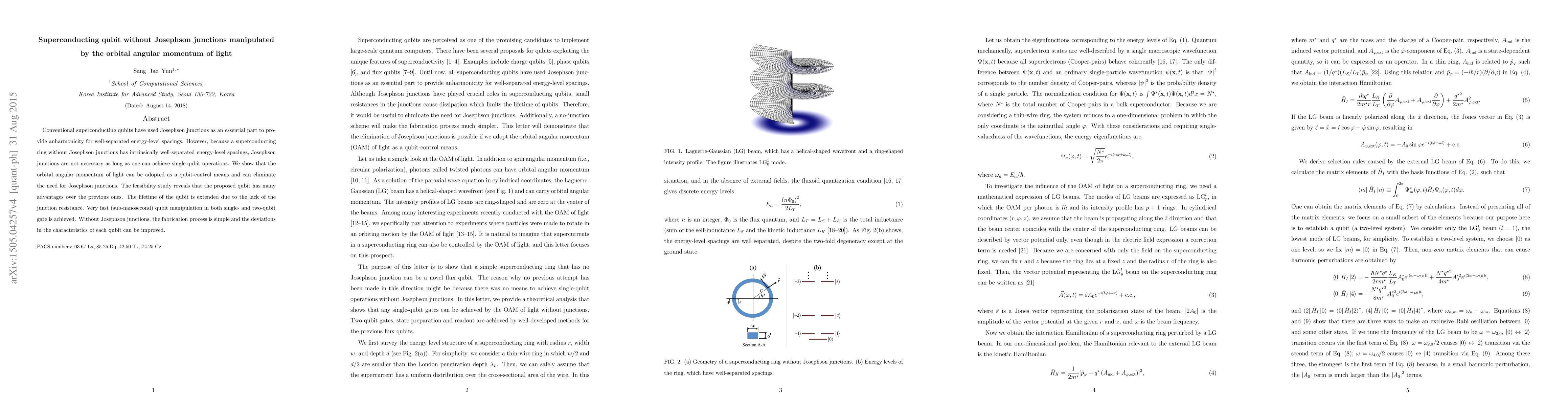 This paper proposes a superconducting qubit design that eliminates Josephson junctions by using the orbital angular momentum of light for qubit manipulation. The absence of Josephson junctions enhances qubit lifetime and enables faster qubit operations, simplifying fabrication and improving qubit characteristics.