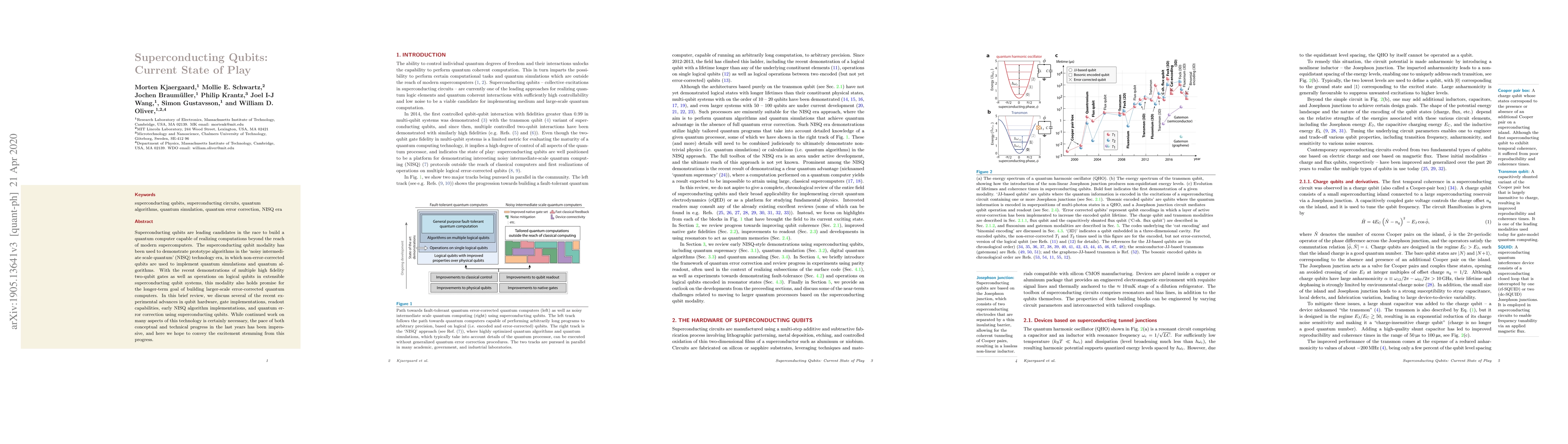 Superconducting qubits are leading candidates in the race to build a quantum computer capable of realizing computations beyond the reach of modern supercomputers. The superconducting qubit modality has been used to demonstrate prototype algorithms in the 'noisy intermediate scale quantum' (NISQ) technology era, in which non-error-corrected qubits are used to implement quantum simulations and quantum algorithms. With the recent demonstrations of multiple high fidelity two-qubit gates as well as operations on logical qubits in extensible superconducting qubit systems, this modality also holds promise for the longer-term goal of building larger-scale error-corrected quantum computers. In this brief review, we discuss several of the recent experimental advances in qubit hardware, gate implementations, readout capabilities, early NISQ algorithm implementations, and quantum error correction using superconducting qubits. While continued work on many aspects of this technology is certainly necessary, the pace of both conceptual and technical progress in the last years has been impressive, and here we hope to convey the excitement stemming from this progress.