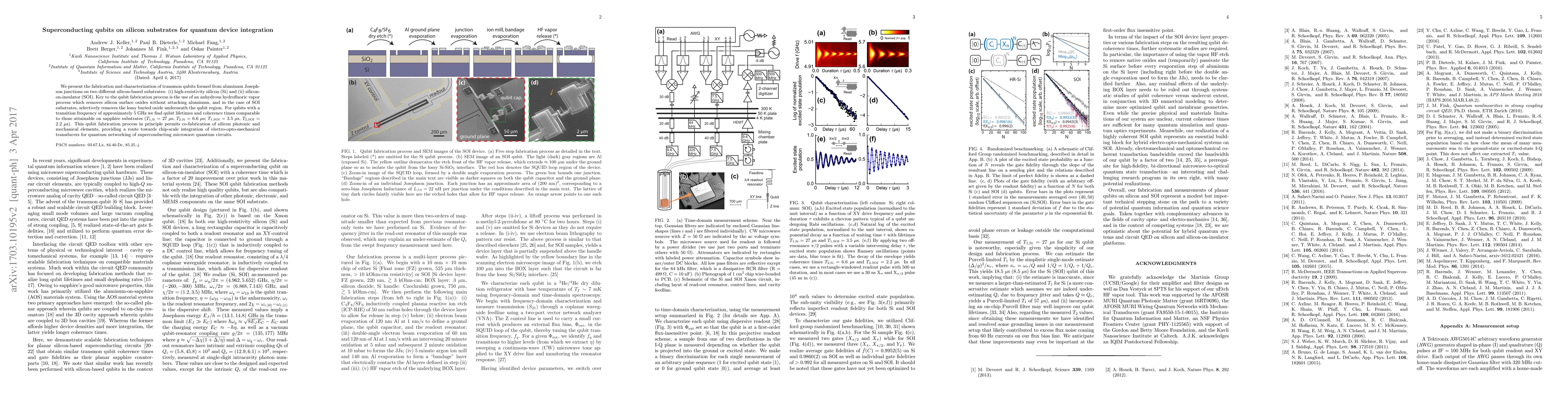 This paper details the fabrication of transmon qubits on silicon and silicon-on-insulator substrates using an anhydrous hydrofluoric vapor process, achieving coherence times comparable to sapphire substrates. The method enables potential integration of silicon photonic and mechanical elements for quantum networking.