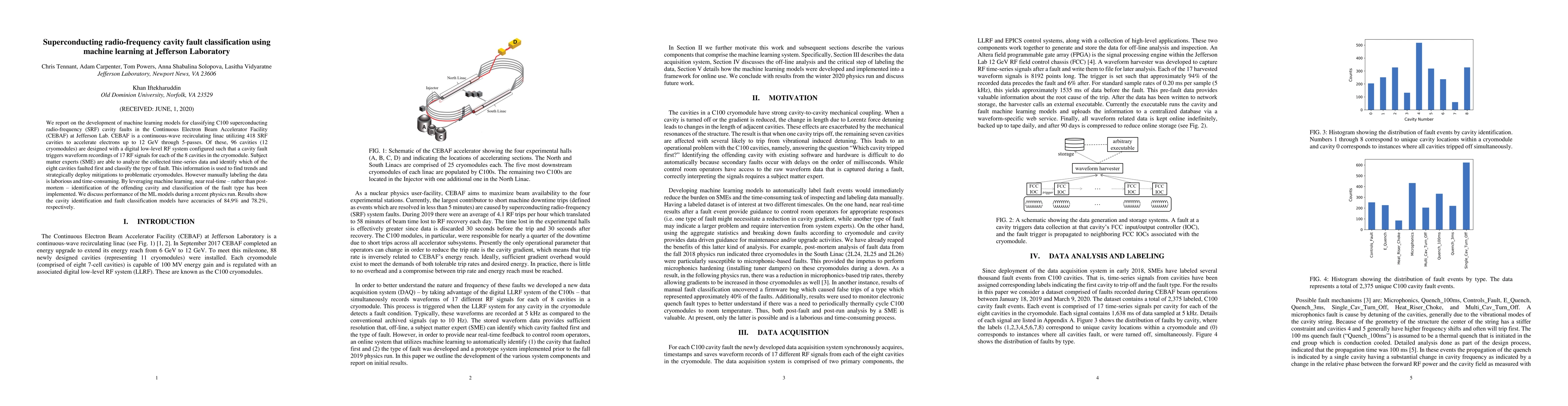 Researchers developed machine learning models to classify faults in superconducting radio-frequency cavities at Jefferson Laboratory, achieving 84.9% accuracy in cavity identification and 78.2% accuracy in fault classification.