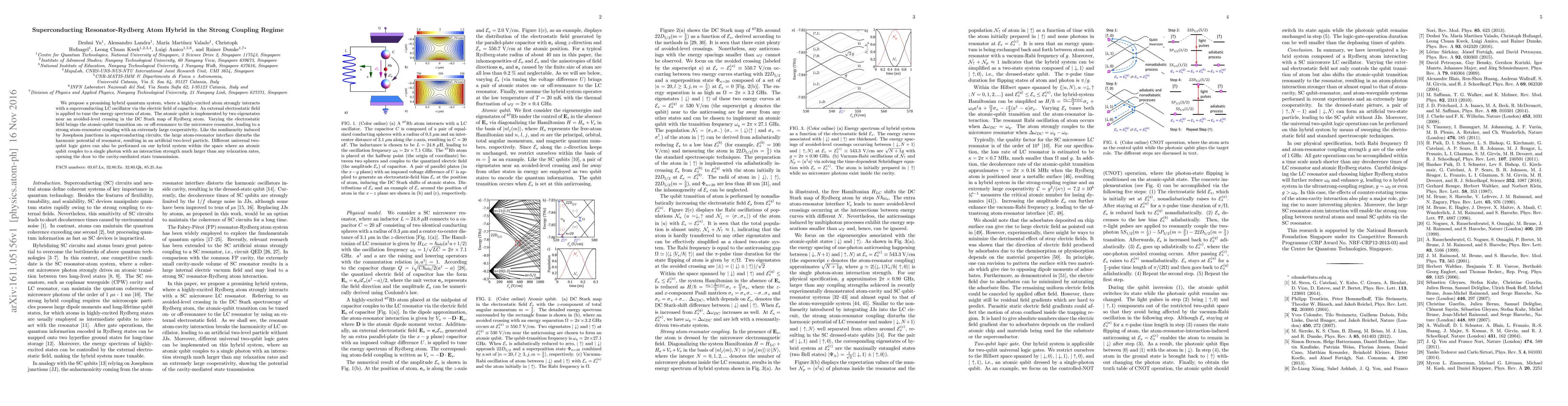 This paper proposes a hybrid quantum system combining a superconducting LC oscillator and a Rydberg atom, achieving strong coupling via an electric field. The system enables large cooperativity and artificial two-level particles, facilitating universal two-qubit logic gates and cavity-mediated state transmission.
