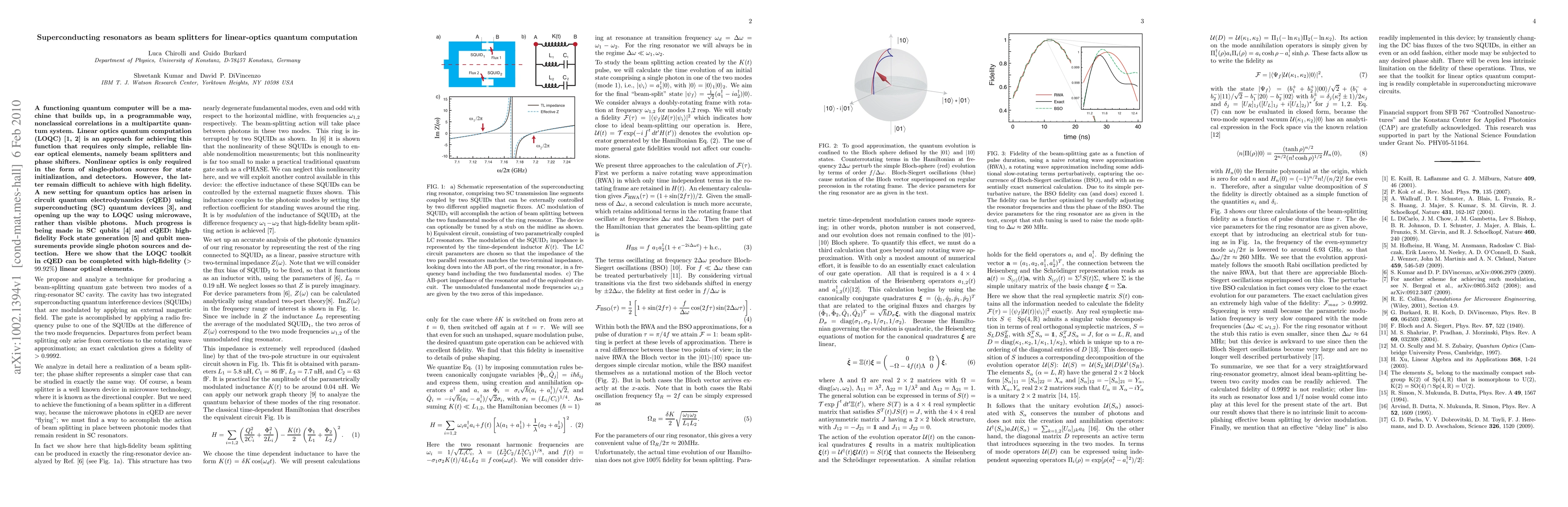 This paper demonstrates that superconducting resonators can function as high-fidelity beam splitters for linear-optics quantum computation (LOQC) in circuit quantum electrodynamics (cQED), achieving fidelity over 99.92%. This advancement enables LOQC using microwave photons, leveraging the progress in superconducting qubits and cQED.