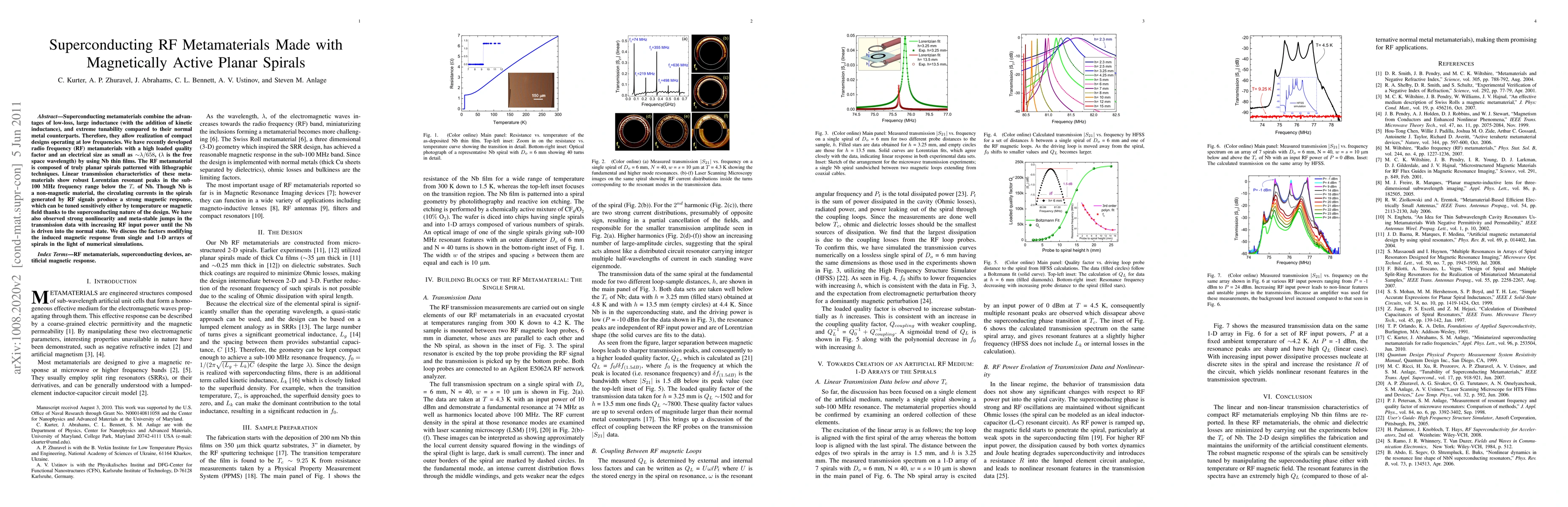 This paper presents the development of superconducting RF metamaterials using Nb thin films with magnetically active planar spirals, demonstrating low-loss, large inductance, and extreme tunability. The metamaterials exhibit Lorentzian resonant peaks in the sub-100 MHz range and show strong nonlinearity and meta-stable jumps when driven into the normal state.