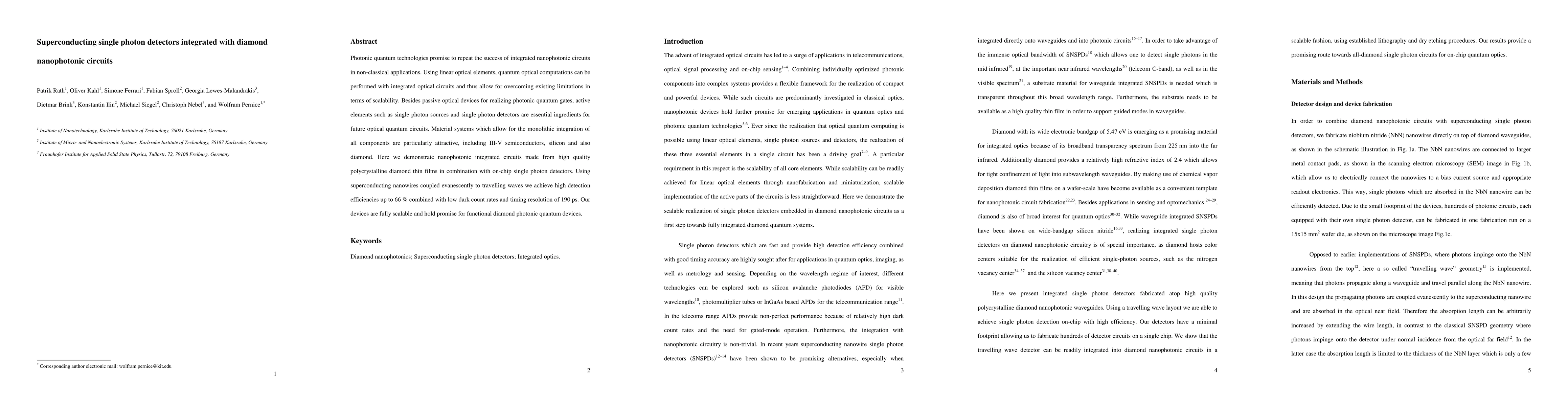 The integration of superconducting nanowire single photon detectors with diamond nanophotonic circuits, demonstrating high detection efficiencies, low dark count rates, and fast timing resolution.