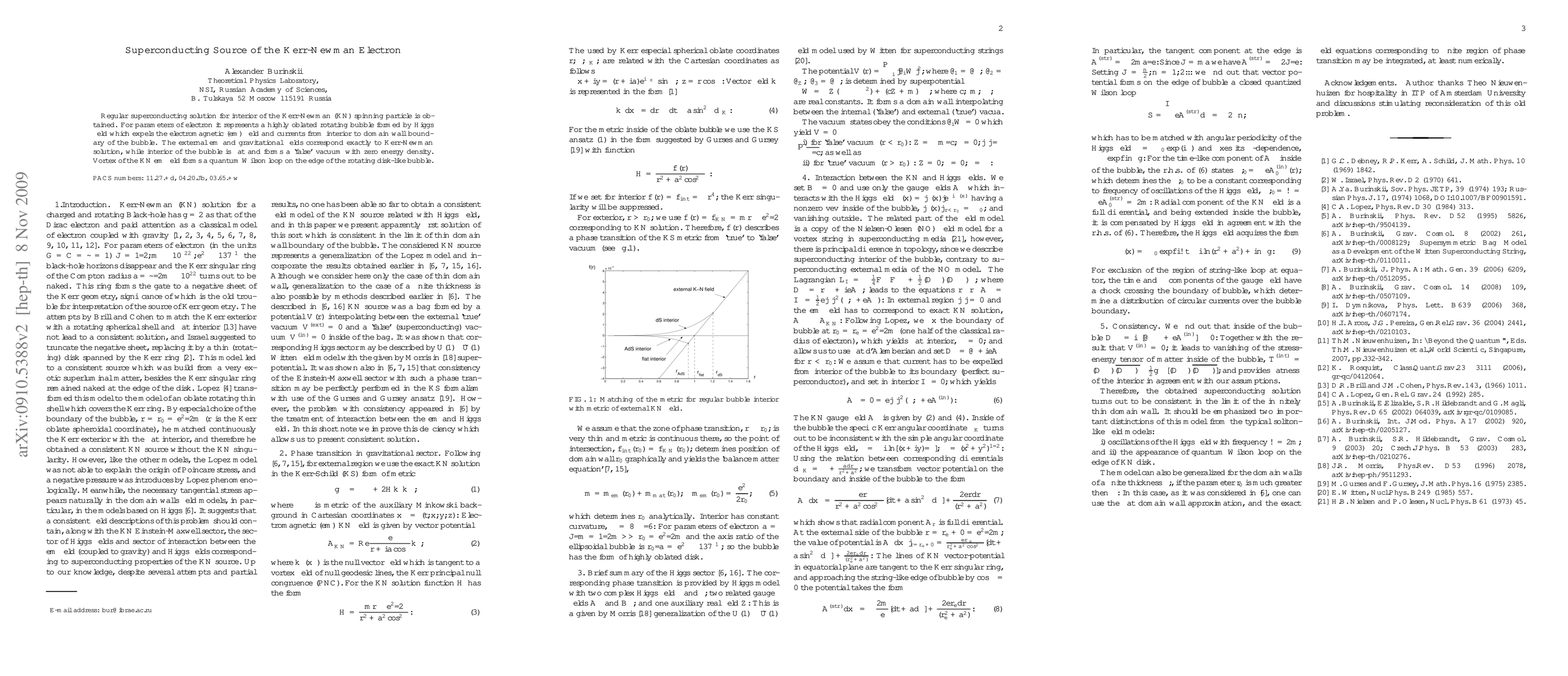 Regular superconducting solution for interior of the Kerr-Newman (KN) spinning particle is obtained. For parameters of electron it represents a highly oblated rotating bubble formed by Higgs field which expels the electromagnetic (em) field and currents from interior to domain wall boundary of the bubble. The external em and gravitational fields correspond exactly to Kerr-Newman solution, while interior of the bubble is flat and forms a `false' vacuum with zero energy density. Vortex of the KN em field forms a quantum Wilson loop on the edge of the rotating disk-like bubble.