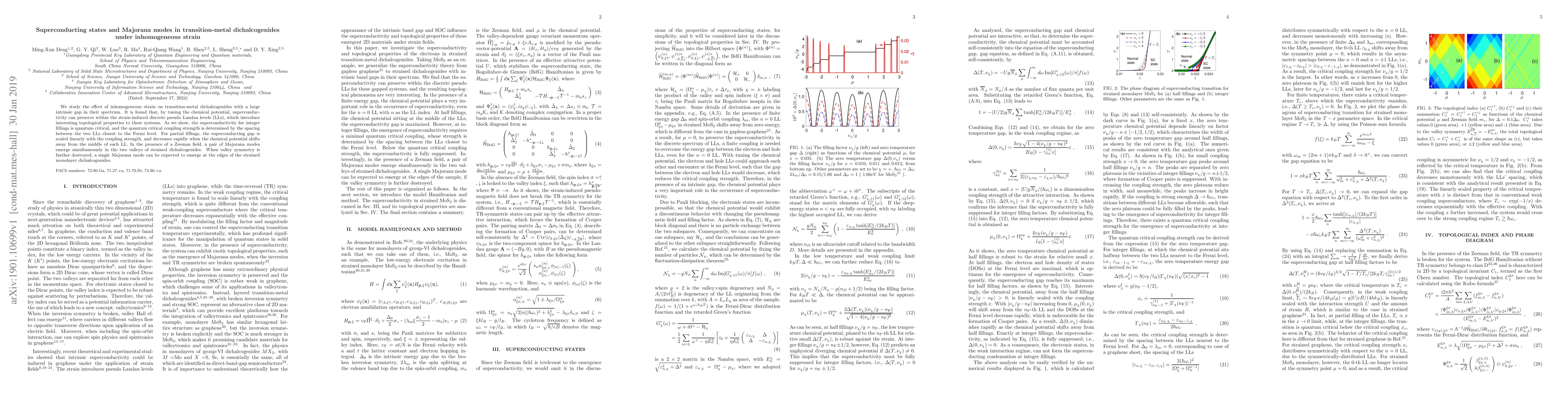 We study the effect of inhomogeneous strain on transition-metal dichalcogenides with a large intrinsic gap in their spectrum. It is found that, by tuning the chemical potential, superconductivity can preserve within the strain-induced discrete pseudo Landau levels (LLs), which introduce interesting topological properties to these systems. As we show, the superconductivity for integer fillings is quantum critical, and the quantum critical coupling strength is determined by the spacing between the two LLs closest to the Fermi level. For partial fillings, the superconducting gap is scaled linearly with the coupling strength, and decreases rapidly when the chemical potential shifts away from the middle of each LL. In the presence of a Zeeman field, a pair of Majorana modes emerge simultaneously in the two valleys of strained dichalcogenides. When valley symmetry is further destroyed, a single Majorana mode can be expected to emerge at the edges of the strained monolayer dichalcogenides.