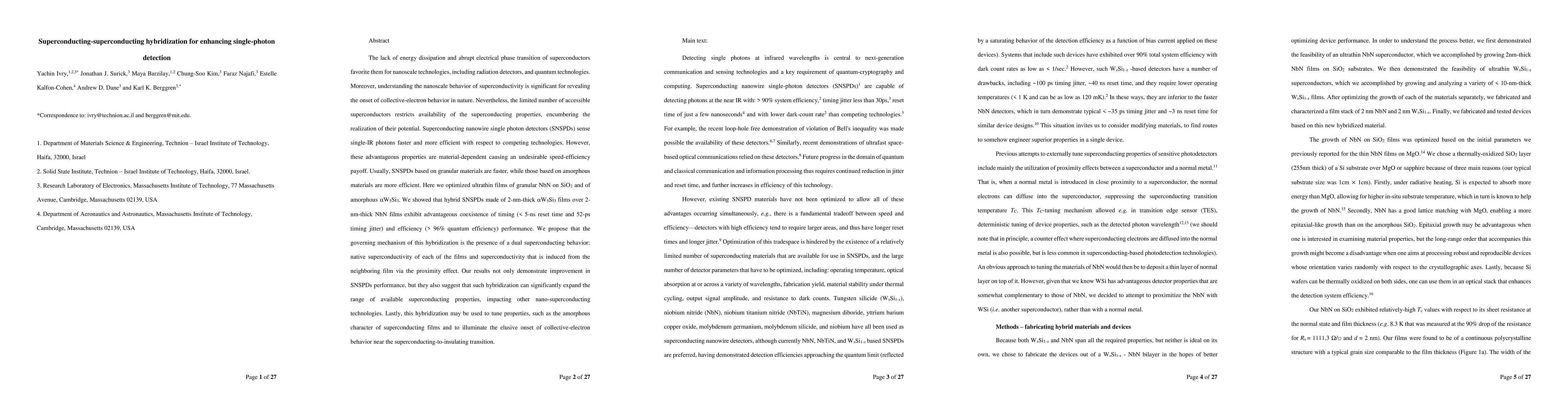 This paper explores the hybridization of superconducting materials to enhance single-photon detection efficiency in superconducting nanowire single photon detectors (SNSPDs). The study demonstrates that hybrid SNSPDs combining ultrathin granular NbN and amorphous W5Si3 films achieve optimal timing and efficiency, suggesting a dual superconducting behavior mechanism.