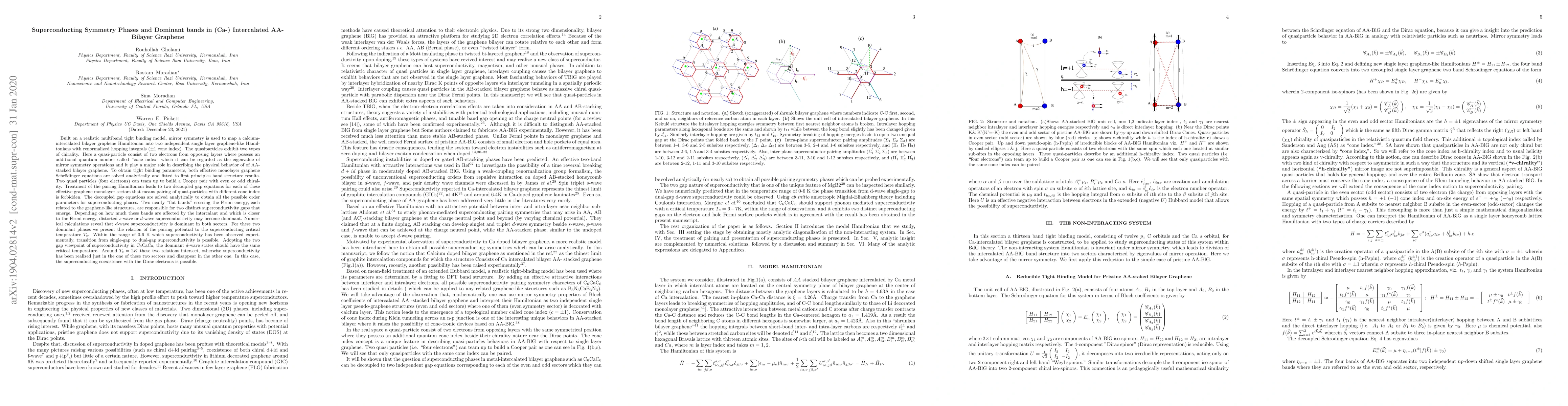 Built on a realistic multiband tight-binding model, mirror symmetry is used to map a calcium-intercalated bilayer graphene Hamiltonian into two independent single layer graphene-like Hamiltonians with renormalized hopping. The quasiparticles exhibit two types of chirality. Here a quasi-particle consists of two electrons from opposing layers where possess an additional quantum number called "cone index" which can be regarded as the eigenvalue of mirror symmetry operations. To obtain tight-binding parameters, both effective monolayer Schrodinger equations are solved analytically and fitted to first-principles band structure results. Two quasi-particles (four electrons) can team up to build a Cooper pair with even or odd chirality. Treatment of the pairing Hamiltonian leads to two decoupled gap equations. The pairing of quasi-particles with different cone indexes is forbidden. The decoupled gap equations are solved analytically to obtain all the possible superconducting phases. Two nearly "flat bands" crossing the Fermi energy, each related to the graphene-like structures, are responsible for two distinct superconductivity gaps that emerge. Depending on how much these bands are affected by the intercalant and which is closer to the Fermi energy, distorted s-wave or d-wave superconductivity may become dominant. Numerical calculations reveal that d-wave superconductivity is dominant in both sectors. For these two dominant phases, within the range of 0-6 K which superconductivity has been observed, numerically the transition from single-gap to dual-gap superconductivity is possible. Adopting the two-gap viewpoint of superconductivity in C$_6$CaC$_6$, the dominant $d$-wave states should have the same critical temperature. Around $T_c=2K$ these two relations intersect, otherwise, superconductivity has been realized just in one of these two sectors and disappears in the other one.