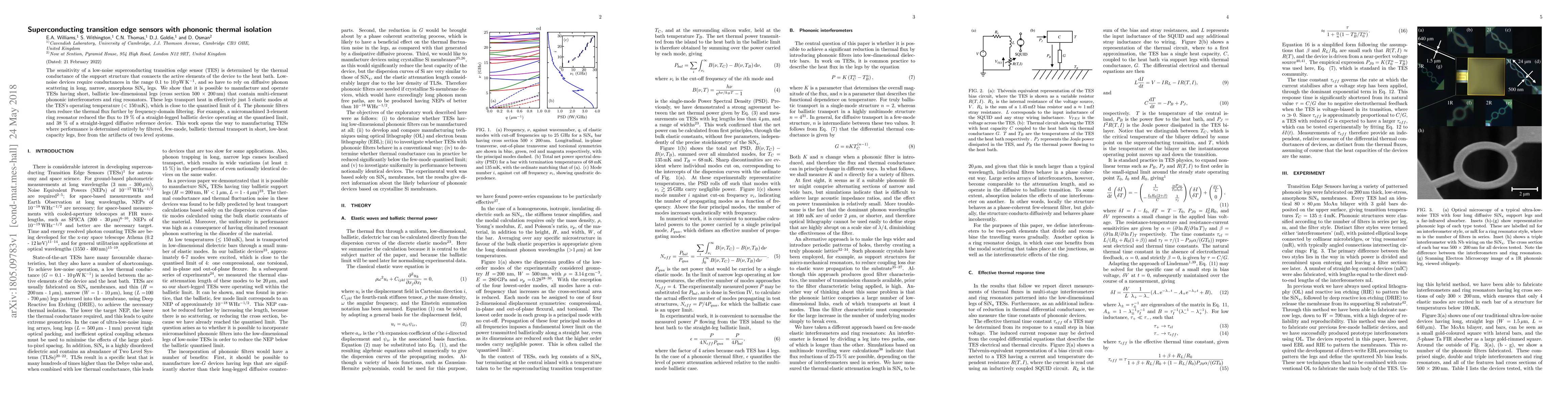 The sensitivity of a low-noise superconducting transition edge sensor (TES) is determined by the thermal conductance of the support structure that connects the active elements of the device to the heat bath. Low-noise devices require conductances in the range 0.1 to 10 pWK$^{-1}$, and so have to rely on diffusive phonon scattering in long, narrow, amorphous SiN$_\text{x}$ legs. We show that it is possible to manufacture and operate TESs having short, ballistic low-dimensional legs (cross section 500$\times$200 nm) that contain multi-element phononic interferometers and ring resonators. These legs transport heat in effectively just 5 elastic modes at the TES's operating temperature (< 150 mK), which is close to the quantised limit of 4. The phononic filters then reduce the thermal flux further by frequency-domain filtering. For example, a micromachined 3-element ring resonator reduced the flux to 19 % of a straight-legged ballistic device operating at the quantised limit, and 38 % of a straight-legged diffusive reference device. This work opens the way to manufacturing TESs where performance is determined entirely by filtered, few-mode, ballistic thermal transport in short, low-heat capacity legs, free from the artifacts of two level systems.