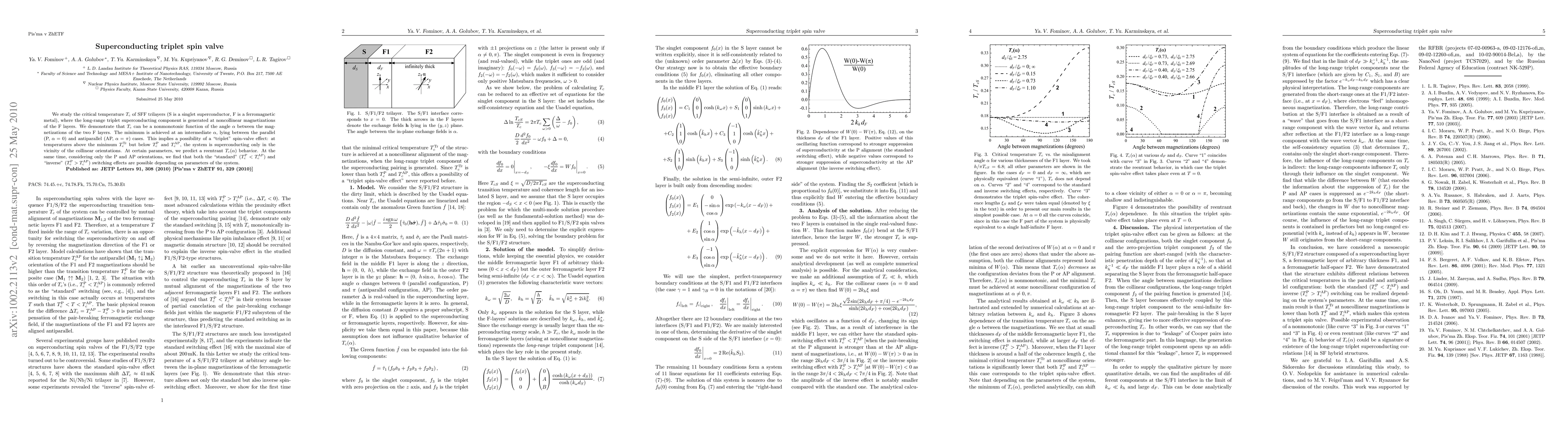 This study investigates the critical temperature T_c of SFF trilayers, revealing a nonmonotonic dependence on the angle between the magnetizations of two ferromagnetic layers. It predicts a "triplet" spin-valve effect and potential reentrant behavior, alongside both "standard" and "inverse" switching effects based on system parameters.
