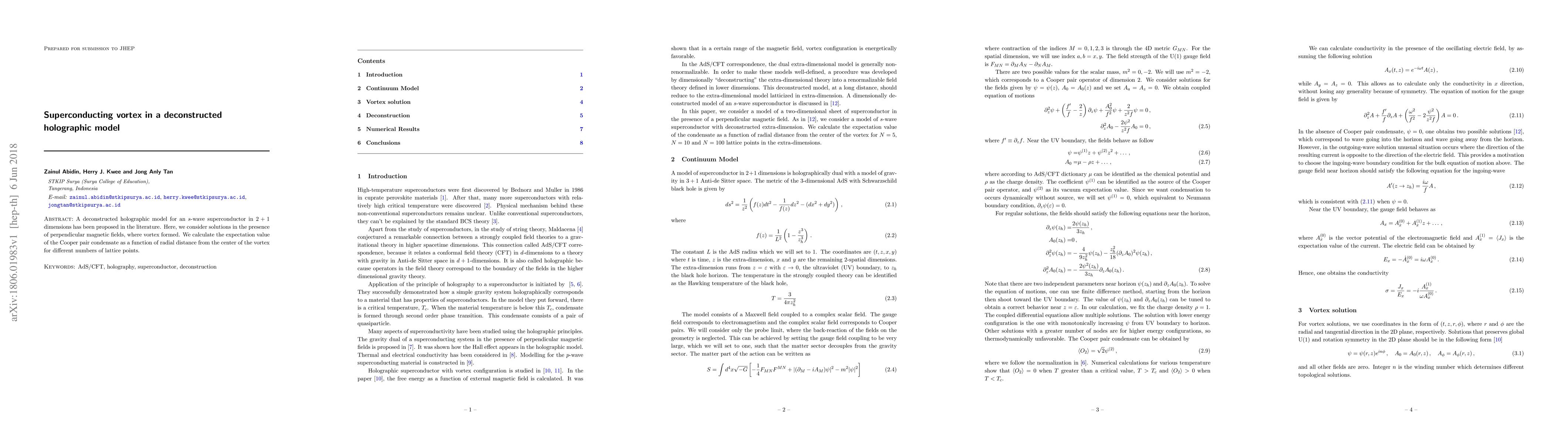 Researchers studied a deconstructed holographic model of a superconductor in 2D with a vortex, calculating how the Cooper pair condensate behaves around it. They found changes in the condensate's distribution as they moved away from the center of the vortex.