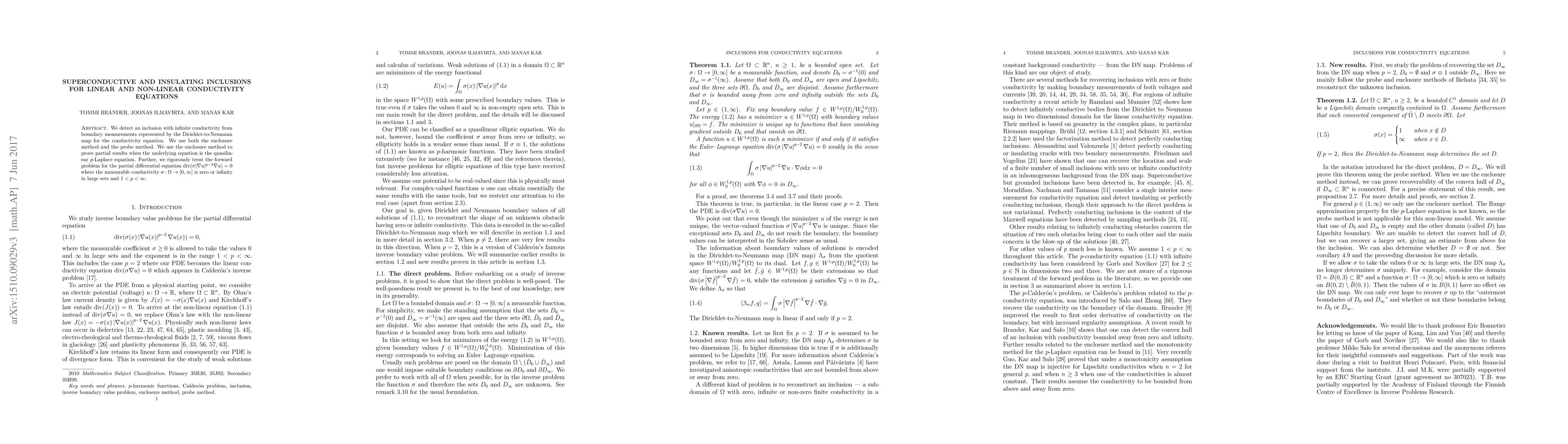 We detect an inclusion with infinite conductivity from boundary measurements represented by the Dirichlet-to-Neumann map for the conductivity equation. We use both the enclosure method and the probe method. We use the enclosure method to prove partial results when the underlying equation is the quasilinear $p$-Laplace equation. Further, we rigorously treat the forward problem for the partial differential equation $\operatorname{div}(\sigma\lvert\nabla u\rvert^{p-2}\nabla u)=0$ where the measurable conductivity $\sigma\colon\Omega\to[0,\infty]$ is zero or infinity in large sets and $1