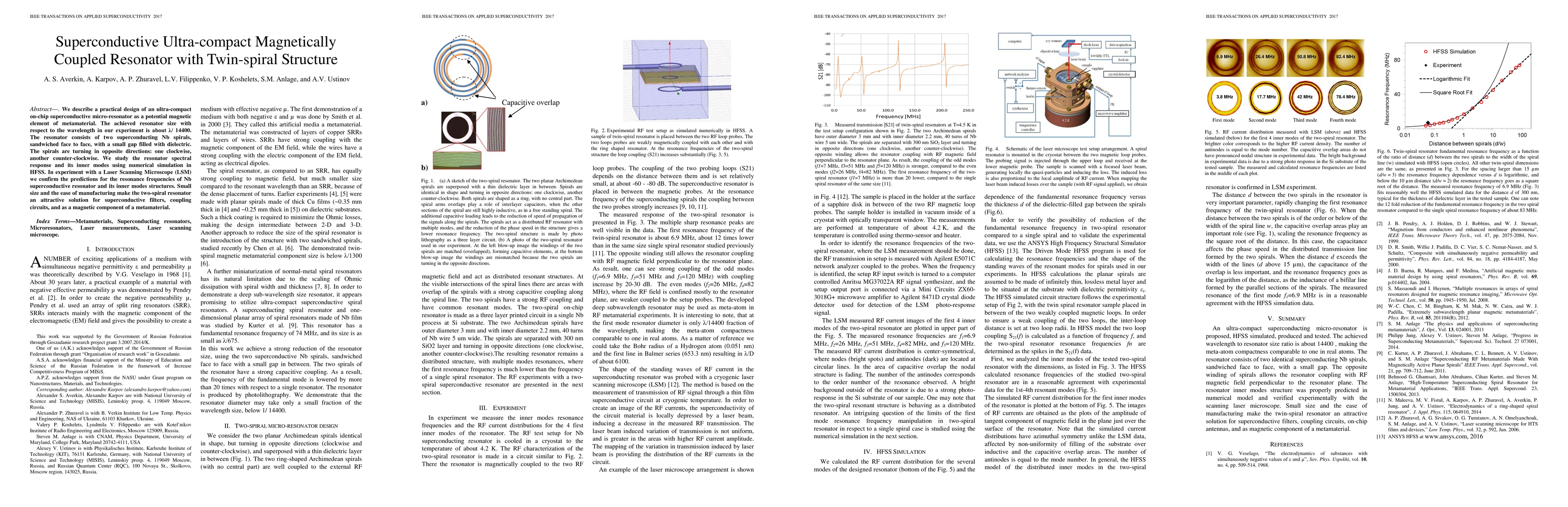 We describe a practical design of an ultra-compact on-chip superconductive micro-resonator as a potential magnetic element of metamaterial. The achieved resonator size with respect to the wavelength in our experiment is about {\lambda}/ 14400. The resonator consists of two superconducting Nb spirals, sandwiched face to face, with a small gap filled with dielectric. The spirals are turning in opposite directions: one clockwise, another counter-clockwise. We study the resonator spectral response and its inner modes using numerical simulation in HFSS. In experiment with a Laser Scanning Microscope (LSM) we confirm the predictions for the resonance frequencies of Nb superconductive resonator and its inner modes structures. Small size and the ease of manufacturing make the two-spiral resonator an attractive solution for superconductive filters, coupling circuits, and as a magnetic component of a metamaterial.