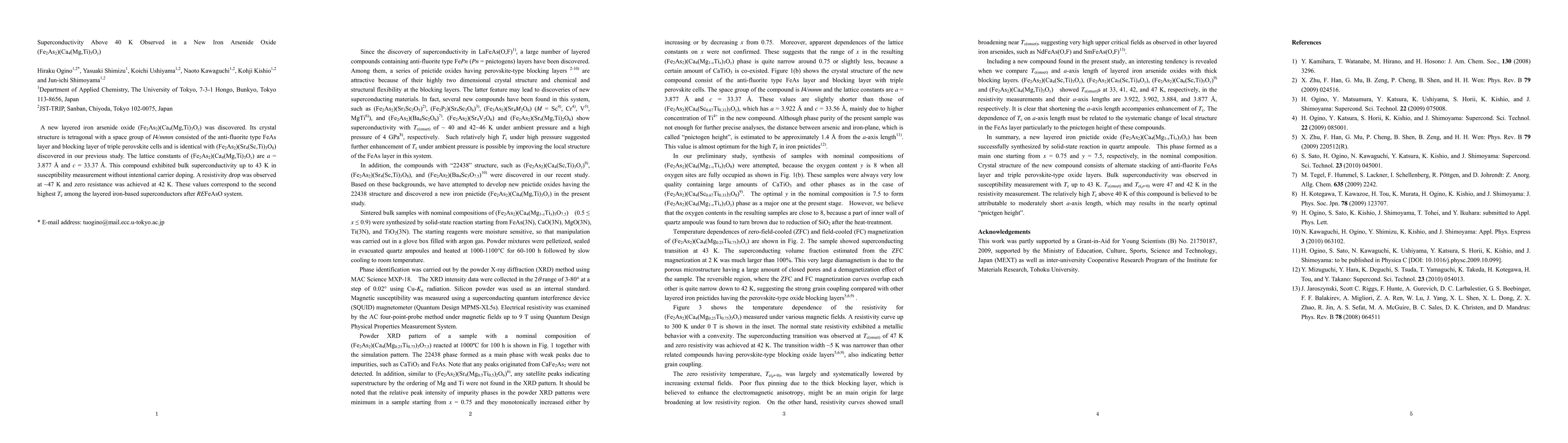 A new layered iron arsenide oxide (Fe2As2)(Ca4(Mg,Ti)3Oy) exhibits superconductivity up to 43 K, demonstrating the second highest critical temperature among iron-based superconductors without carrier doping. The compound's crystal structure is tetragonal with a space group of I4/mmm.