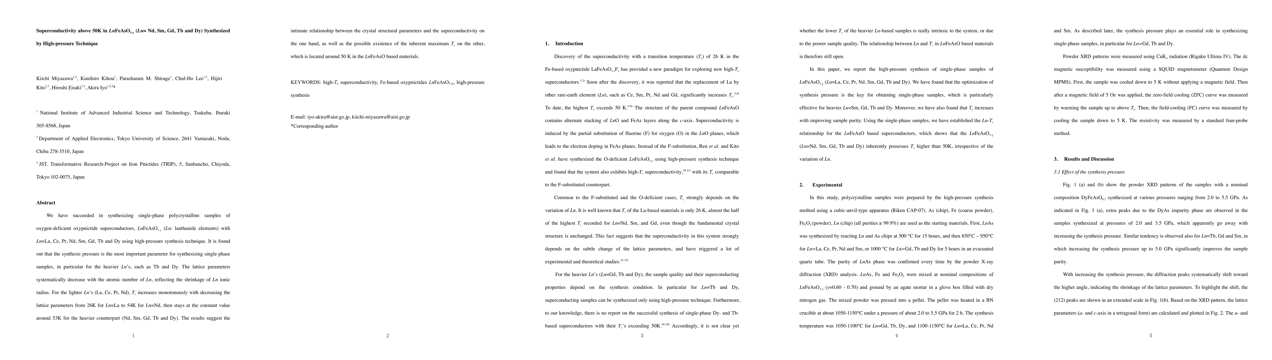 This study reports the successful synthesis of LnFeAsO1-y superconductors under high pressure, achieving superconductivity above 50K, with the highest transition temperature of 54K observed for NdFeAsO1-y. The research highlights the critical role of synthesis pressure in obtaining single-phase samples and notes a plateau in Tc for heavier lanthanides, suggesting an inherent maximum Tc around 50K in these materials.