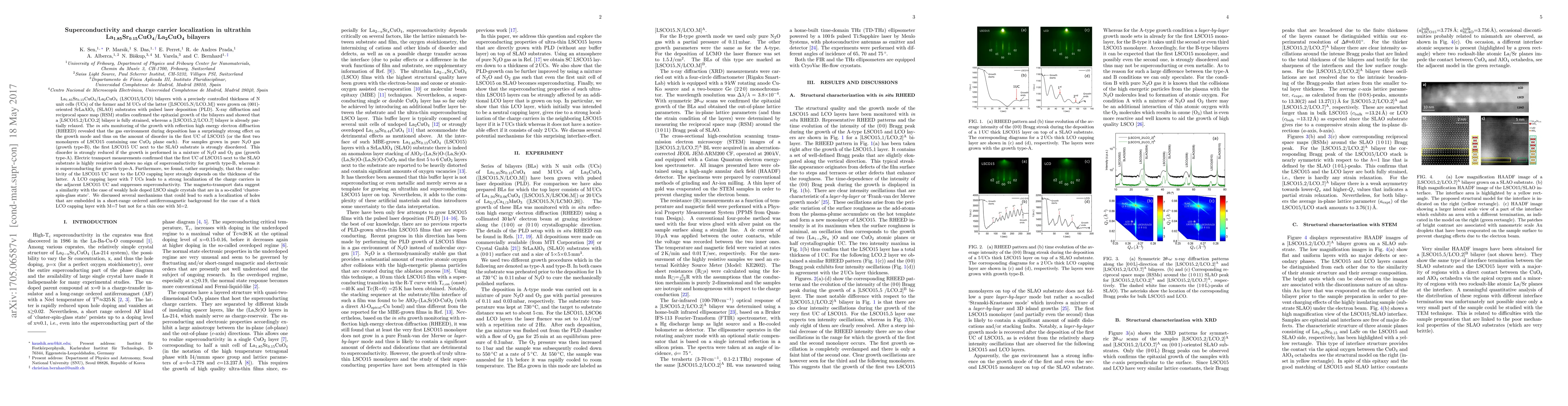 $\mathrm{La_{1.85}Sr_{0.15}CuO_4}$/$\mathrm{La_2CuO_4}$ (LSCO15/LCO) bilayers with a precisely controlled thickness of N unit cells (UCs) of the former and M UCs of the latter ([LSCO15\_N/LCO\_M]) were grown on (001)-oriented {\slao} (SLAO) substrates with pulsed laser deposition (PLD). X-ray diffraction and reciprocal space map (RSM) studies confirmed the epitaxial growth of the bilayers and showed that a [LSCO15\_2/LCO\_2] bilayer is fully strained, whereas a [LSCO15\_2/LCO\_7] bilayer is already partially relaxed. The \textit{in situ} monitoring of the growth with reflection high energy electron diffraction (RHEED) revealed that the gas environment during deposition has a surprisingly strong effect on the growth mode and thus on the amount of disorder in the first UC of LSCO15 (or the first two monolayers of LSCO15 containing one $\mathrm{CuO_2}$ plane each). For samples grown in pure $\mathrm{N_2O}$ gas (growth type-B), the first LSCO15 UC next to the SLAO substrate is strongly disordered. This disorder is strongly reduced if the growth is performed in a mixture of $\mathrm{N_2O}$ and $\mathrm{O_2}$ gas (growth type-A). Electric transport measurements confirmed that the first UC of LSCO15 next to the SLAO substrate is highly resistive and shows no sign of superconductivity for growth type-B, whereas it is superconducting for growth type-A. Furthermore, we found, rather surprisingly, that the conductivity of the LSCO15 UC next to the LCO capping layer strongly depends on the thickness of the latter. A LCO capping layer with 7~UCs leads to a strong localization of the charge carriers in the adjacent LSCO15 UC and suppresses superconductivity. The magneto-transport data suggest a similarity with the case of weakly hole doped LSCO single crystals that are in a so-called {"{cluster-spin-glass state}"}