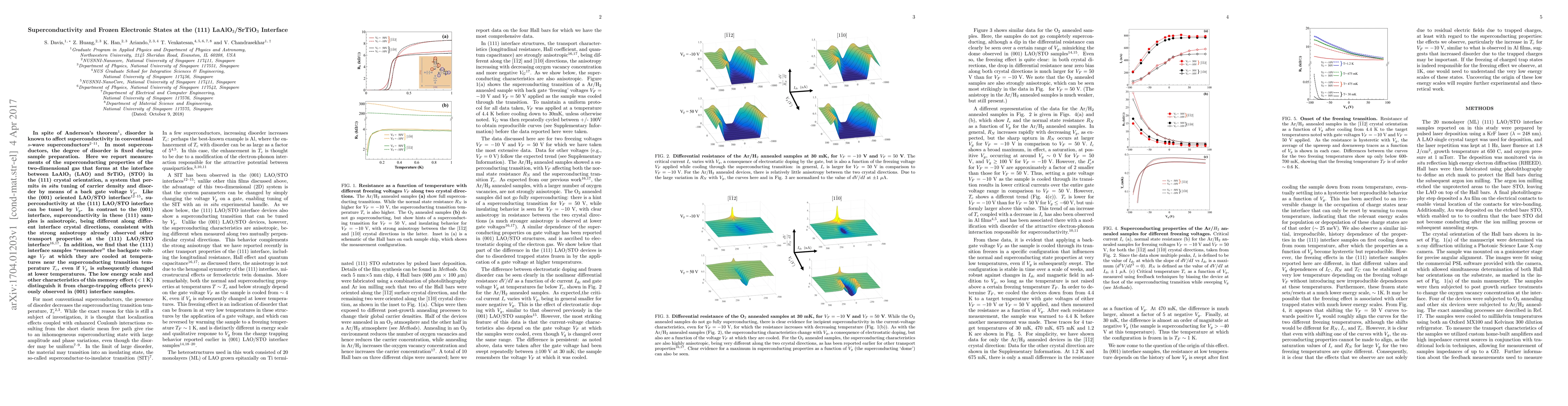 In spite of Anderson's theorem, disorder is known to affect superconductivity in conventional s-wave superconductors. In most superconductors, the degree of disorder is fixed during sample preparation. Here we report measurements of the superconducting properties of the two-dimensional gas that forms at the interface between LaAlO$_3$ (LAO) and SrTiO$_3$ (STO) in the (111) crystal orientation, a system that permits \emph{in situ} tuning of carrier density and disorder by means of a back gate voltage $V_g$. Like the (001) oriented LAO/STO interface, superconductivity at the (111) LAO/STO interface can be tuned by $V_g$. In contrast to the (001) interface, superconductivity in these (111) samples is anisotropic, being different along different interface crystal directions, consistent with the strong anisotropy already observed other transport properties at the (111) LAO/STO interface. In addition, we find that the (111) interface samples "remember" the backgate voltage $V_F$ at which they are cooled at temperatures near the superconducting transition temperature $T_c$, even if $V_g$ is subsequently changed at lower temperatures. The low energy scale and other characteristics of this memory effect ($<1$ K) distinguish it from charge-trapping effects previously observed in (001) interface samples.