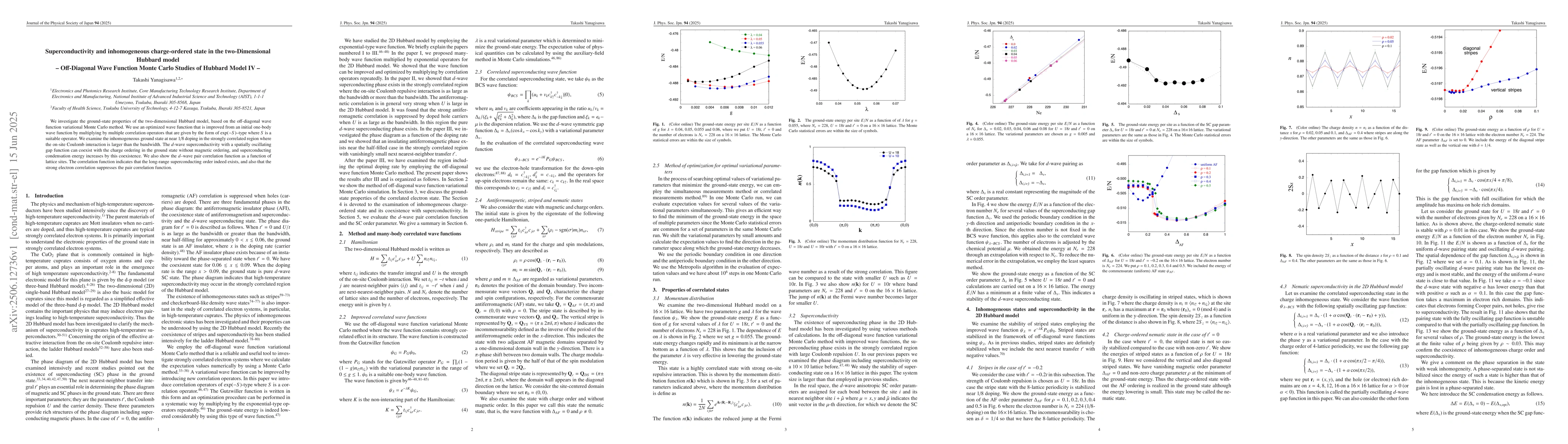 We investigate the ground-state properties of the two-dimensional Hubbard model, based on the off-diagonal wave function variational Monte Carlo method. We use an optimized wave function that is improved from an initial one-body wave function by multiplying by multiple correlation operators that are given by the form of exp($-S$)-type where $S$ is a suitable operator. We examine the inhomogeneous ground state at near 1/8 doping in the strongly correlated region where the on-site Coulomb interaction is larger than the bandwidth. The $d$-wave superconductivity with a spatially oscillating gap function can coexist with the charge ordering in the ground state without magnetic ordering, and superconducting condensation energy increases by this coexistence. We also show the $d$-wave pair correlation function as a function of lattice sites. The correlation function indicates that the long-range superconducting order indeed exists, and also that the strong electron correlation suppresses the pair correlation function.