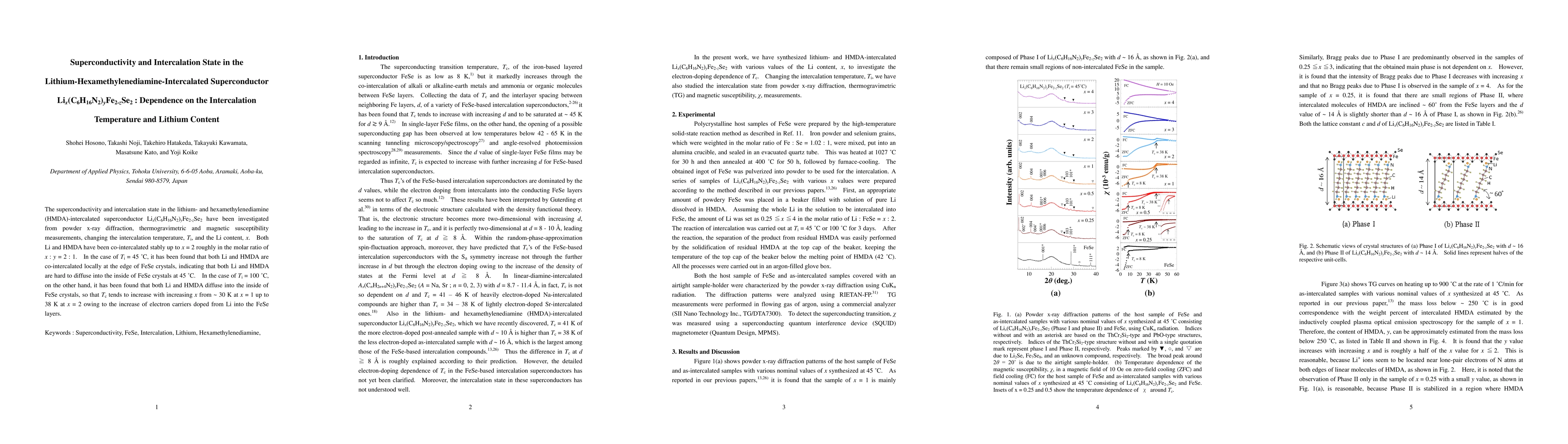 This research investigates the superconducting properties and intercalation state in Li$_x$(C$_6$H$_{16}$N$_2$)$_y$Fe$_{2-z}$Se$_2$ by varying intercalation temperature and lithium content. At 45°C, Li and hexamethylenediamine (HMDA) co-intercalate at FeSe crystal edges. At 100°C, Li and HMDA diffuse inside FeSe crystals, enhancing superconductivity from ~30 K to 38 K with increased lithium content due to higher electron doping.