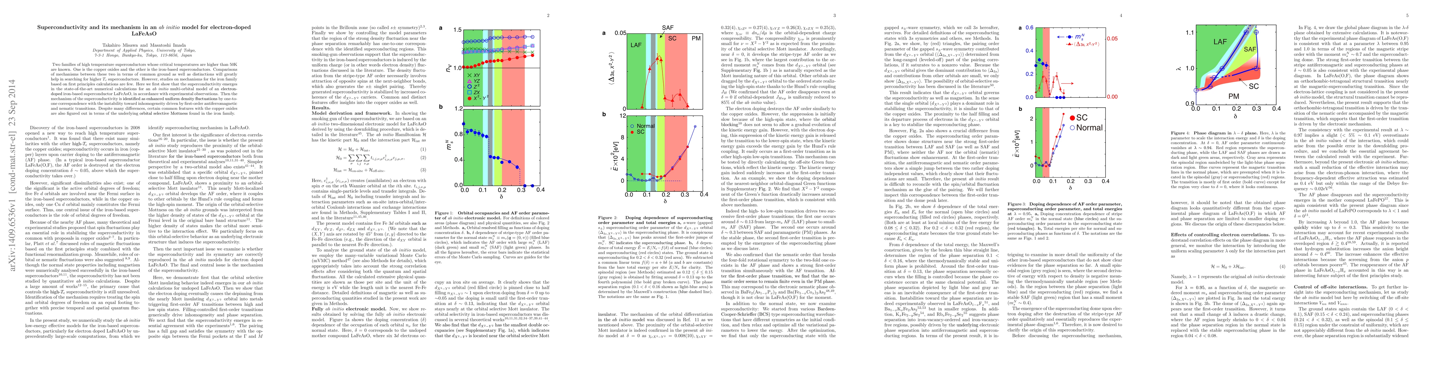 This paper demonstrates superconductivity in an ab initio model for electron-doped LaFeAsO, revealing a mechanism driven by enhanced uniform density fluctuations and connections to antiferromagnetic and nematic transitions, while also identifying similarities with copper oxide superconductors.
