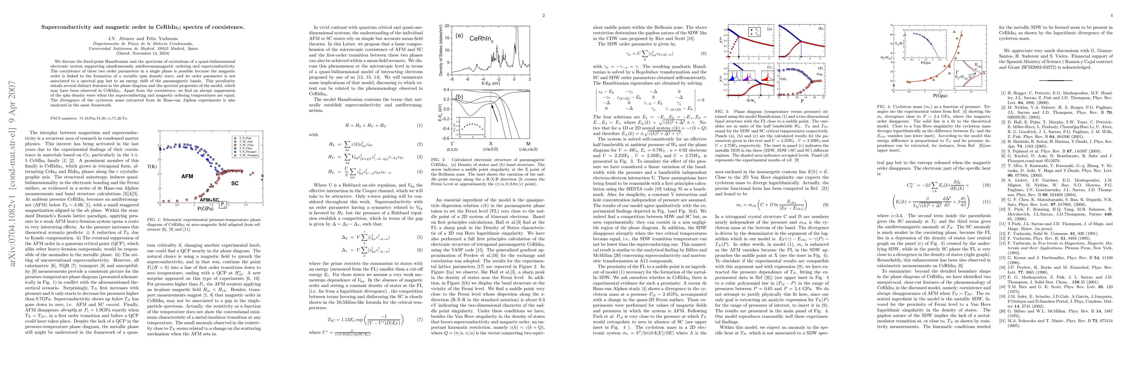 We discuss the fixed-point Hamiltonian and the spectrum of excitations of a quasi-bidimensional electronic system supporting simultaneously antiferromamagnetic ordering and superconductivity. The coexistence of these two order parameters in a single phase is possible because the magnetic order is linked to the formation of a spin density wave, and its order parameter is not associated to a spectral gap but to an energy shift of the paramagnetic bands. This peculiarity entails several distinct features in the phase diagram and the spectral properties of the model, which may have been observed in CeRhIn$_5$. Apart from the coexistence, we find an abrupt suppression of the spin density wave when the superconducting and magnetic ordering temperatures are equal. The divergence of the cyclotron mass extracted from de Haas-van Alphen experiments is also analyzed in the same framework.