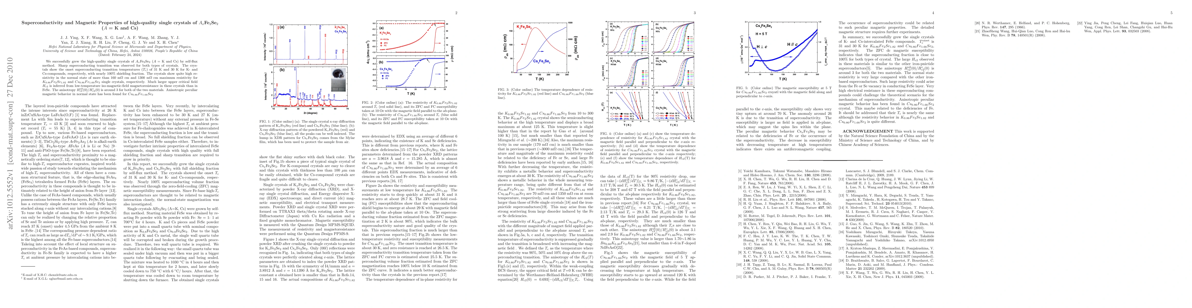 We successfully grew the high-quality single crystals of $A_{x}$Fe$_2$Se$_2$ ($A$ = K and Cs) by self-flux method. Sharp superconducting transition was observed for both types of crystals. The crystals show the onset superconducting transition temperatures ($T_{\rm c}$) of 31 K and 30 K for K- and Cs-compounds, respectively, with nearly 100% shielding fraction. The crystals show quite high resistivity in the normal state of more than 160 m$\Omega$ cm and 1300 m$\Omega$ cm maximum resistivity for $K_{0.86}Fe_2Se_{1.82}$ and $Cs_{0.86}Fe_{1.66}Se_{2}$ single crystals, respectively. Much larger upper critical field $H_{\rm c2}$ is inferred from low-temperature iso-magnetic-field magnetoresistance in these crystals than in FeSe. The anisotropy $H^{ab}_{\rm c2}$(0)/$H^{c}_{\rm c2}$(0) is around 3 for both of the two materials. Anisotropic peculiar magnetic behavior in normal state has been found for $Cs_{0.86}Fe_{1.66}Se_{2}$