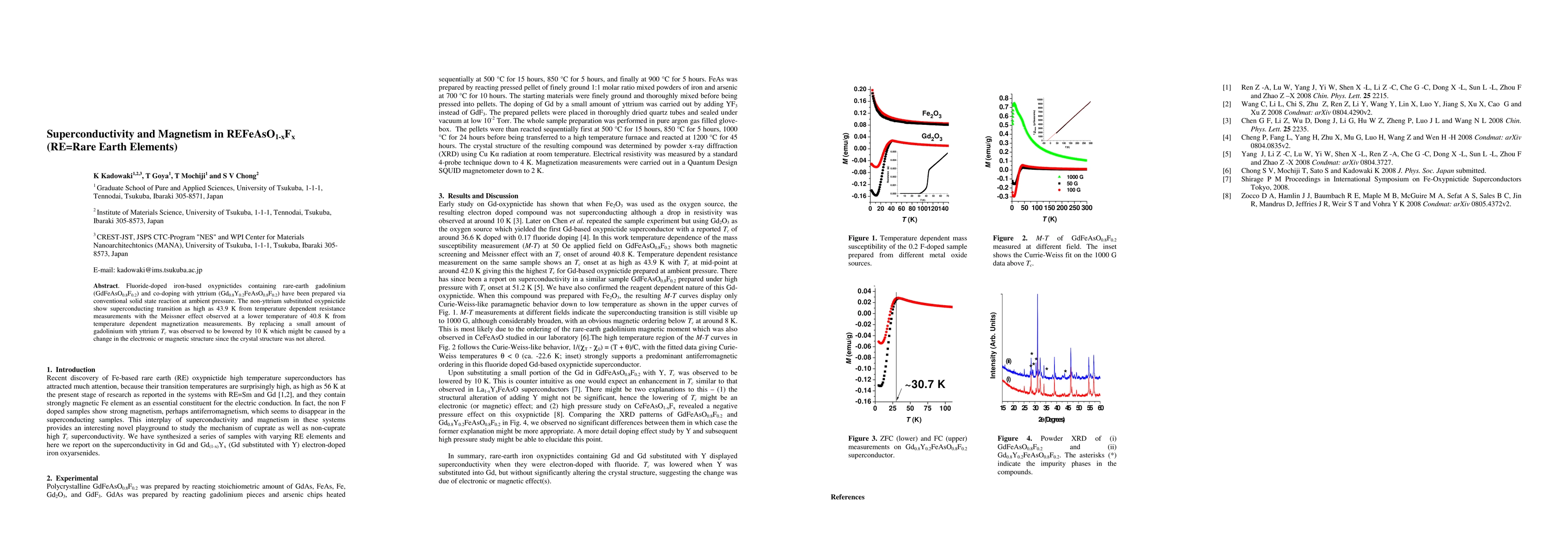 This paper investigates superconductivity and magnetism in fluoride-doped iron-based oxypnictides with rare-earth elements, specifically gadolinium and yttrium. The GdFeAsO0.8F0.2 compound exhibits superconductivity up to 43.9 K, while co-doping with yttrium lowers the transition temperature by 10 K, suggesting changes in electronic or magnetic structures despite unchanged crystal structure.