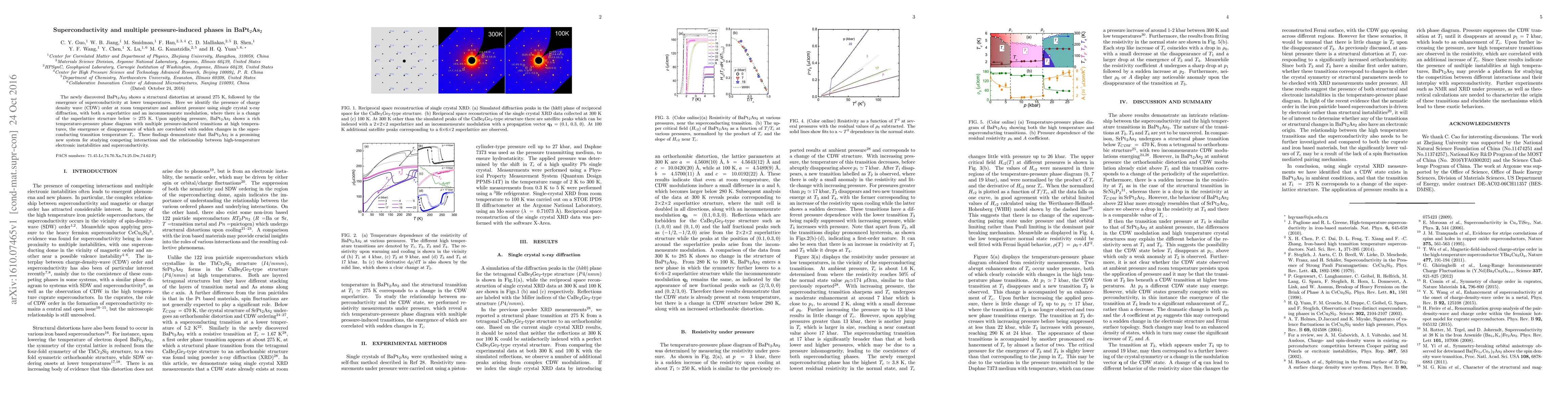 BaPt$_2$As$_2$ exhibits superconductivity and complex pressure-induced phases, including charge density wave order, with significant changes in superconducting transition temperature $T_c$ under pressure, making it a promising material for studying competing electronic interactions.