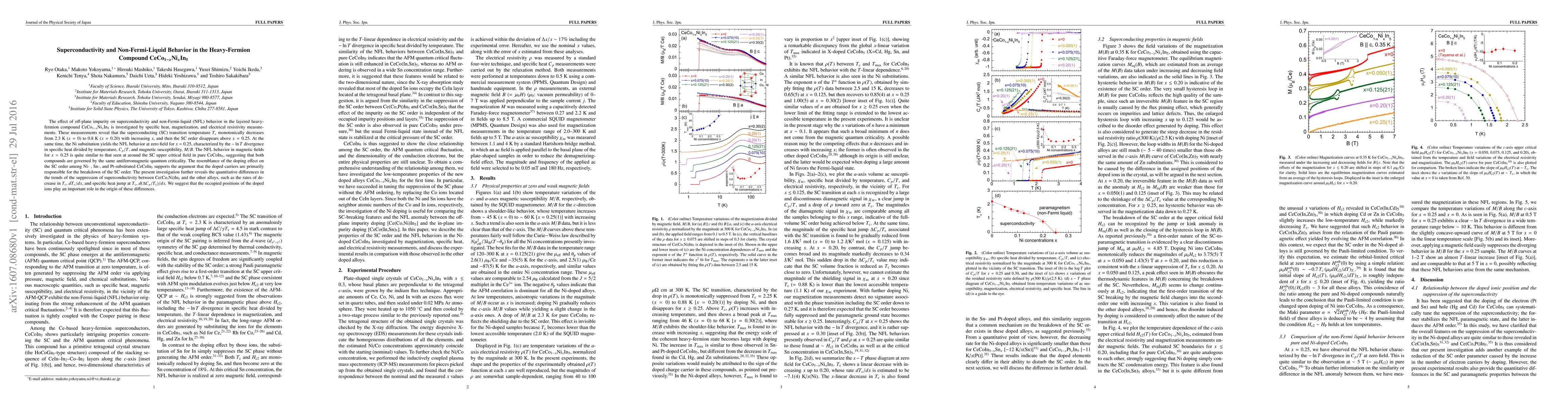The effect of off-plane impurity on superconductivity and non-Fermi-liquid (NFL) behavior in the layered heavy-fermion compound CeCo$_{1-x}$Ni$_x$In$_5$ is investigated by specific heat, magnetization, and electrical resistivity measurements. These measurements reveal that the superconducting (SC) transition temperature T$_c$ monotonically decreases from 2.3 K (x=0) to 0.8 K (x=0.20) with increasing x, and then the SC order disappears above x=0.25. At the same time, the Ni substitution yields the NFL behavior at zero field for x=0.25, characterized by the -ln T divergence in specific heat divided by temperature, C$_p$/T, and magnetic susceptibility, M/B. The NFL behavior in magnetic fields for x=0.25 is quite similar to that seen at around the SC upper critical field in pure CeCoIn$_5$, suggesting that both compounds are governed by the same antiferromagnetic quantum criticality. The resemblance of the doping effect on the SC order among Ni- , Sn-, and Pt-substituted CeCoIn5 supports the argument that the doped carriers are primarily responsible for the breakdown of the SC order. The present investigation further reveals the quantitative differences in the trends of the suppression of superconductivity between Ce(Co,Ni)In$_5$ and the other alloys, such as the rates of decrease in T$_c$, dT$_c$/dx, and specific heat jump at T$_c$, d($\Delta$C$_p$/T$_c$)/dx. We suggest that the occupied positions of the doped ions play an important role in the origin of these differences.