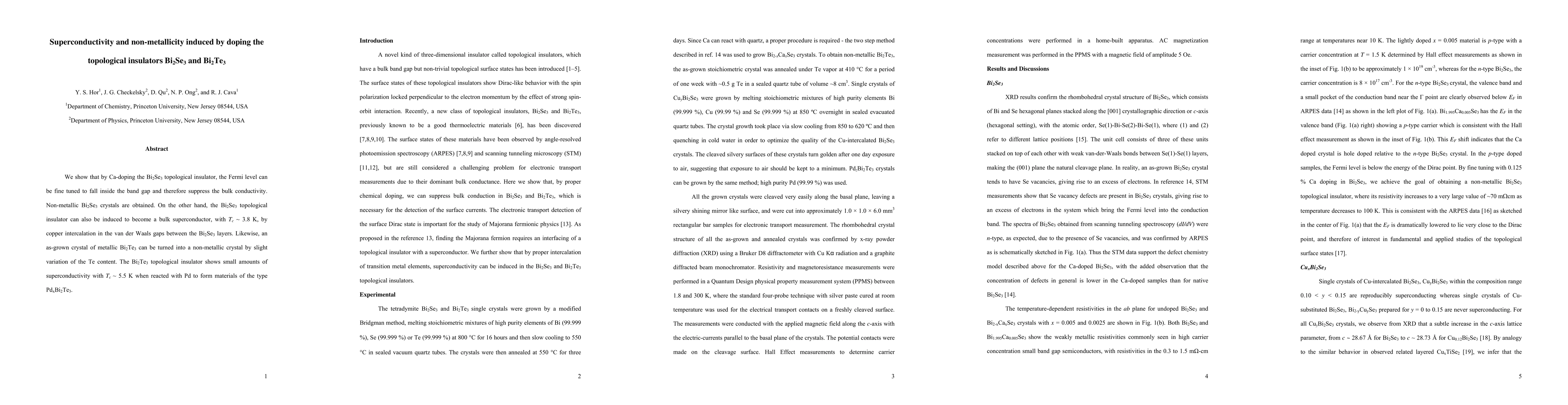 This paper demonstrates that doping topological insulators Bi2Se3 and Bi2Te3 with Ca and Cu can induce non-metallicity and superconductivity, respectively, with Tc values of ~3.8 K for Bi2Se3 and ~5.5 K for PdxBi2Te3.