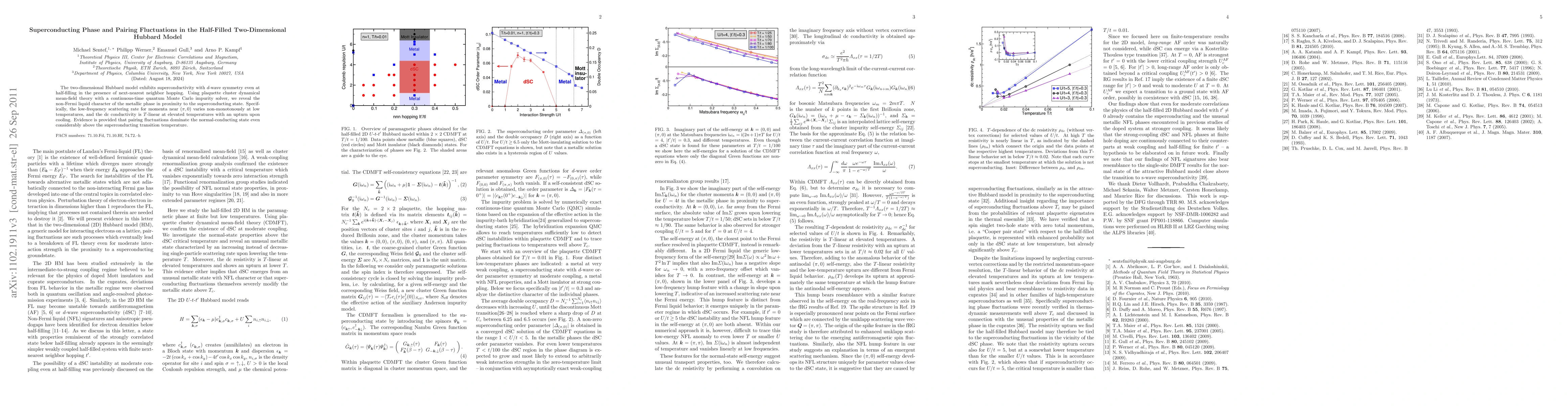 The study reveals d-wave superconductivity in the half-filled two-dimensional Hubbard model with next-nearest neighbor hopping, and shows that pairing fluctuations dominate the metallic phase near the superconducting transition, leading to non-Fermi liquid behavior.