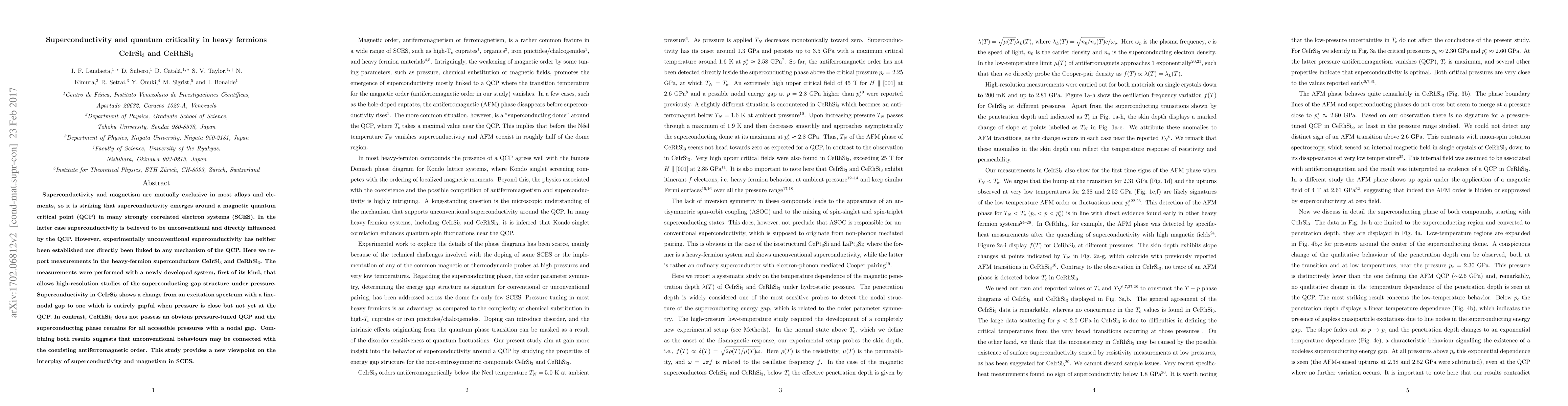 Superconductivity and magnetism are mutually exclusive in most alloys and elements, so it is striking that superconductivity emerges around a magnetic quantum critical point (QCP) in many strongly correlated electron systems (SCES). In the latter case superconductivity is believed to be unconventional and directly influenced by the QCP. However, experimentally unconventional superconductivity has neither been established nor directly been linked to any mechanism of the QCP. Here we report measurements in the heavy-fermion superconductors CeIrSi$_3$ and CeRhSi$_3$. The measurements were performed with a newly developed system, first of its kind, that allows high-resolution studies of the superconducting gap structure under pressure. Superconductivity in CeIrSi$_3$ shows a change from an excitation spectrum with a line-nodal gap to one which is entirely gapful when pressure is close but not yet at the QCP. In contrast, CeRhSi$_3$ does not possess an obvious pressure-tuned QCP and the superconducting phase remains for all accessible pressures with a nodal gap. Combining both results suggests that unconventional behaviours may be connected with the coexisting antiferromagnetic order. This study provides a new viewpoint on the interplay of superconductivity and magnetism in SCES.
